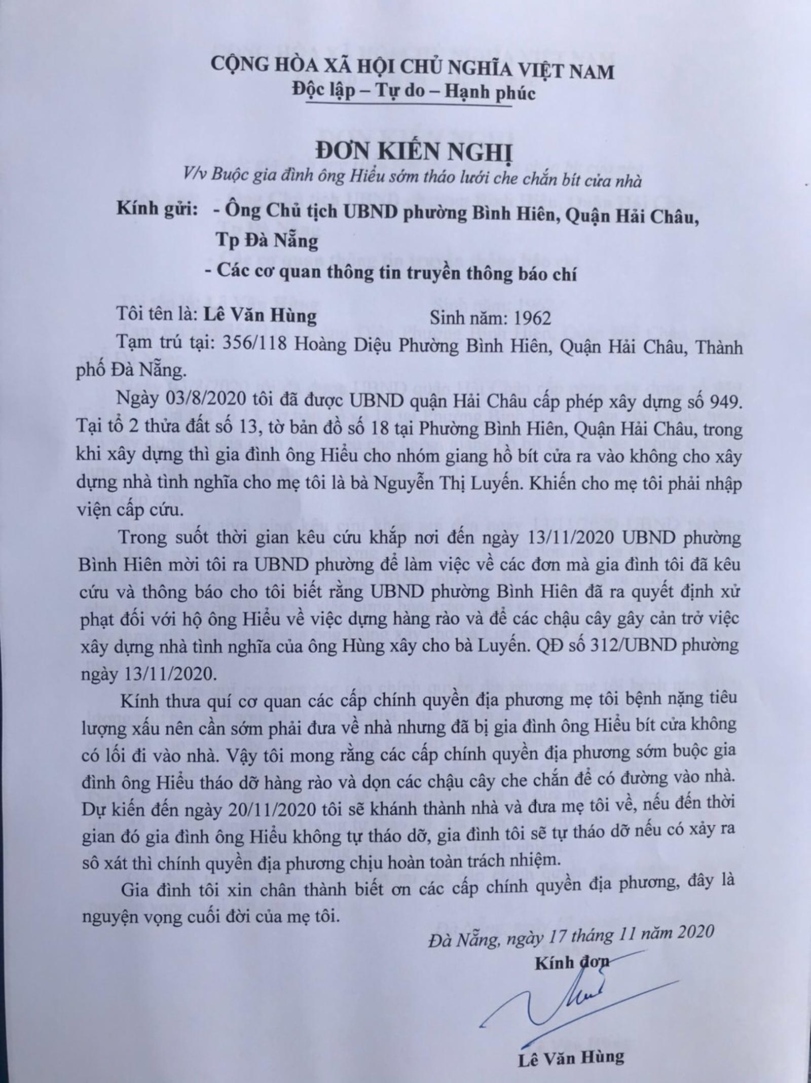 Việc gia đình ông Hiểu bà Lữ cho người rào bít cửa, không cho gia đình ông Hùng đi ra hướng kiệt 305 Nguyễn Hoàng, ông Đặng Văn Khánh, Chủ tịch UBND phường Bình Hiên trình bày, ngay sau khi có đơn khiếu nại UBND phường đã mời hai bên làm việc. Phường yêu cầu ông Hiểu bà Lữ trong thời gian 5 ngày để tự tháo dỡ, tiếp đó gia hạn thêm 4 ngày nhưng ông Hiểu vẫn không thực hiện. Ngày 13/11, UBND phường đã ban hành quyết định xử phạt vi phạm hành chính 750 ngàn đồng đối với hành vi vi phạm của ông Hiểu. Yêu cầu ông Hiểu trong vòng 10 ngày (đến ngày 23/11) phải tháo dỡ vật cản, nếu không phường sẽ cưỡng chế.