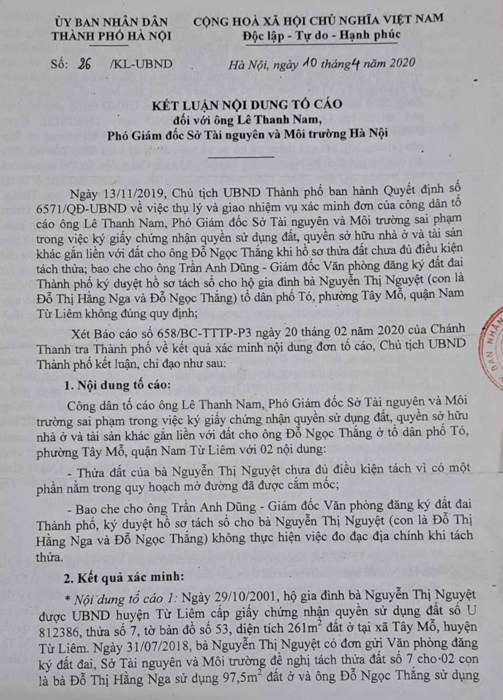 Kết quả xác minh cho thấy, ngày 10/4/2020, UBND thành phố Hà Nội đã ban hành Kết luận số 26/KL-UBND kết luận nội dung tố cáo đối với lãnh đạo Sở TN&MT trong việc ký giấy chứng nhận quyền sử dụng đất (GCNQSDĐ), quyền sở hữu nhà ở gắn liền với đất cho ông Đỗ Ngọc Thắng và bà Đỗ Thị Hằng Nga đã kết luận: Việc tách thửa đất và cấp GCNQSDĐ, quyền sở hữu nhà ở gắn liền với đất cho ông Đỗ Ngọc Thắng và bà Đỗ Thị Hằng Nga (con bà Nguyễn Thị Nguyệt) mà không thực hiện đo đạc địa chính là chưa đúng với quy định tại mục a, khoản 3, Điều 75 Nghị định số 43/2014/NĐ-CP ngày 15/5/2014 của Chính phủ.