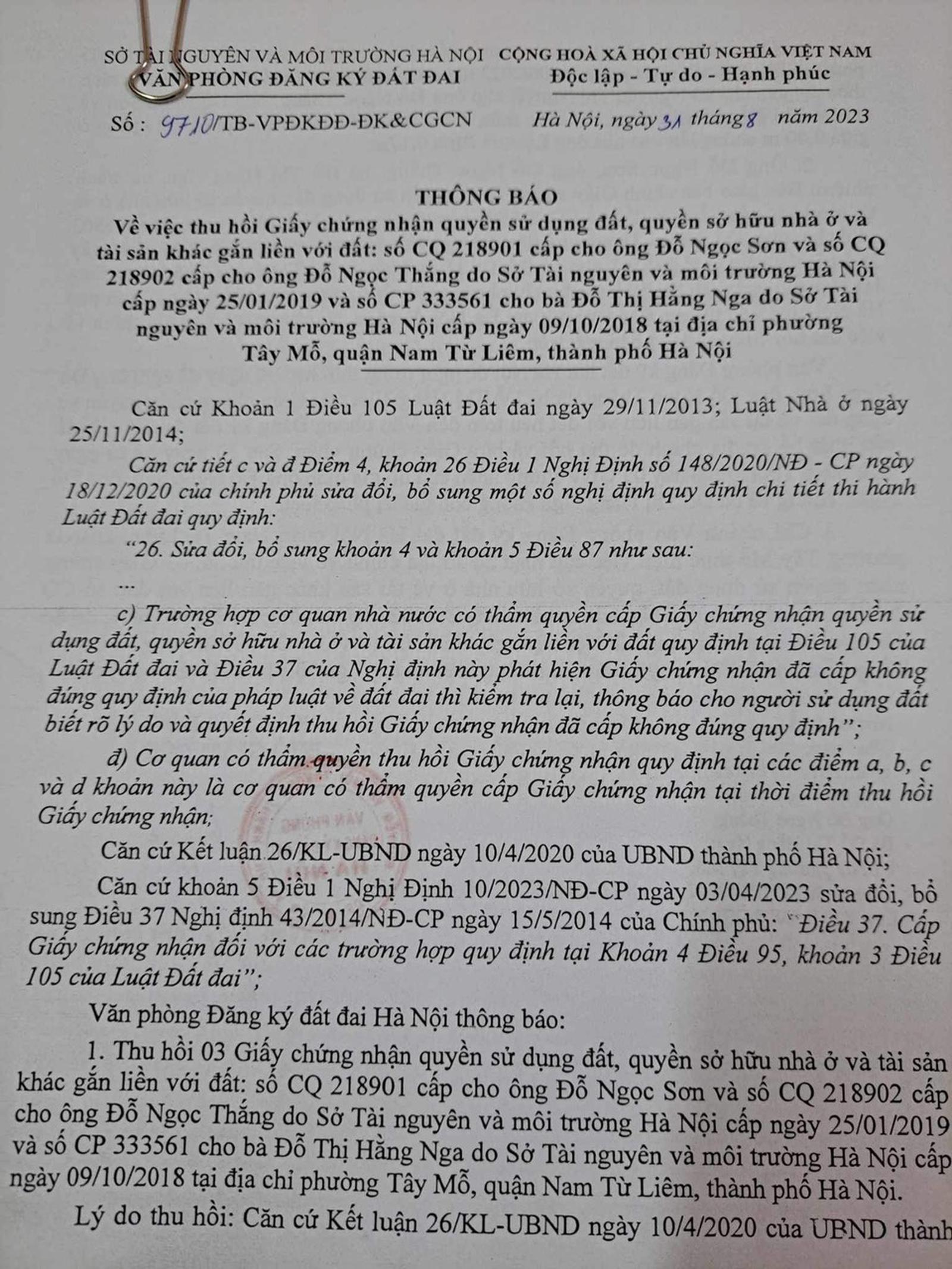 Đến ngày 31/8/2023, VPĐKĐĐ Hà Nội mới ban hành Thông báo số 9710 thu hồi 3 GCNQSDĐ, quyền sở hữu nhà ở và tài sản khác gắn liền với đất số CQ 218901 cấp cho ông Đỗ Ngọc Sơn; số CQ 218902 cấp cho ông Đỗ Ngọc Thắng do Sở TN&MT Hà Nội cấp ngày 25/1/2019 và số CP 333561 cấp cho bà Đỗ Thị Hằng Nga do Sở TN&MT Hà Nội cấp ngày 9/10/2018 tại địa chỉ phường Tây Mỗ, quận Nam Từ Liêm.
