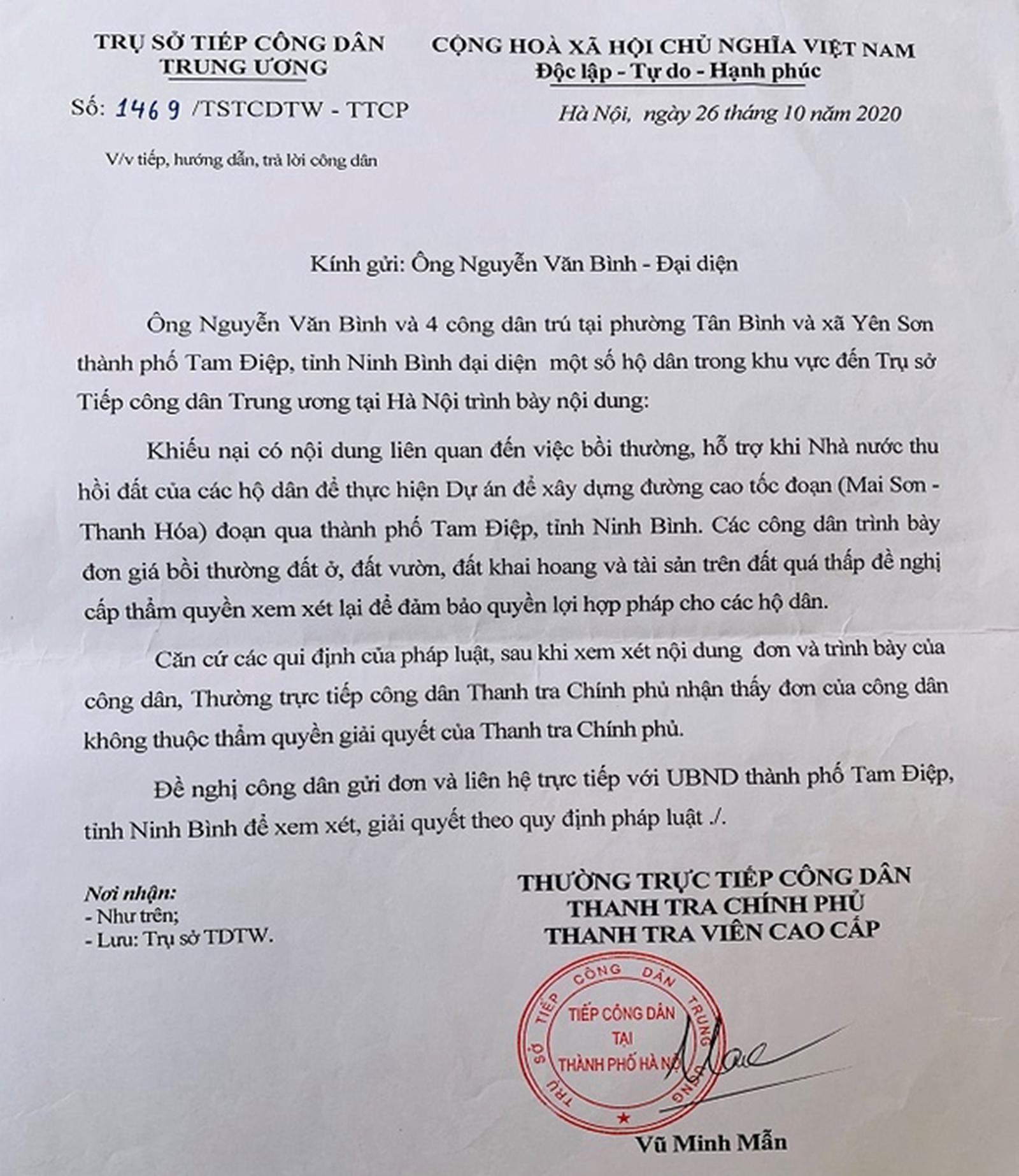 “Cực chẳng đã, chúng tôi đành phải gửi đơn vượt cấp. Sau khi nhận được đơn của chúng tôi, Ban Tiếp Công dân Trung ương và Ban Nội chính Tỉnh ủy Ninh Bình đã chuyển nội dung đơn và hướng dẫn chúng tôi liên hệ với UBND TP Tam Điệp để được xem xét giải quyết theo quy định của pháp luật, nhưng đến nay UBND TP Tam Điệp vẫn không xem xét giải quyết làm ảnh hưởng đến quyền và lợi ích của các hộ dân chúng tôi” - ông Nguyễn Văn Bình, tổ 8, phường Tân Bình nói.