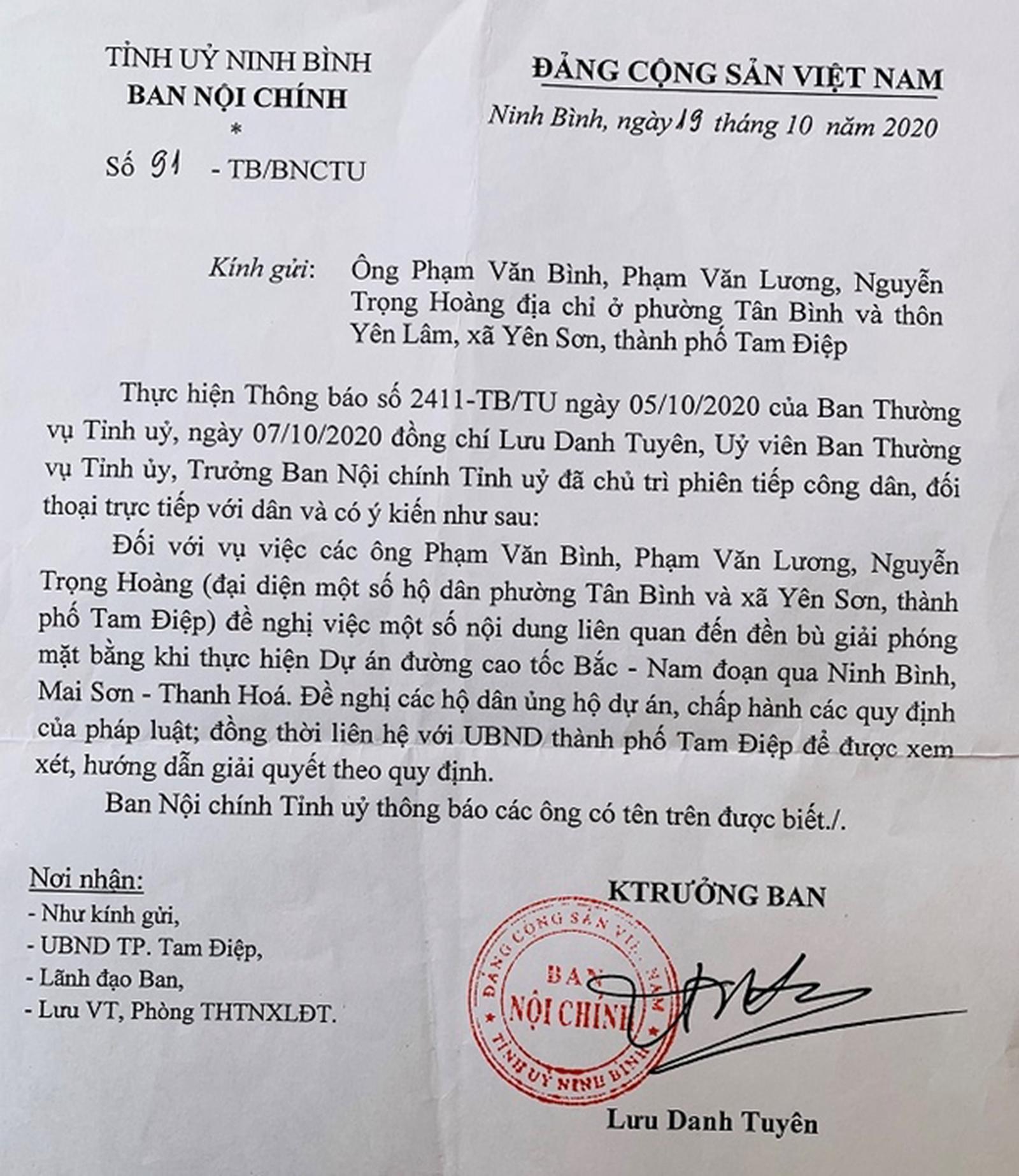Văn bản số 91 của Ban Nội chính Tỉnh ủy Ninh Bình. Ảnh: Nhóm PV