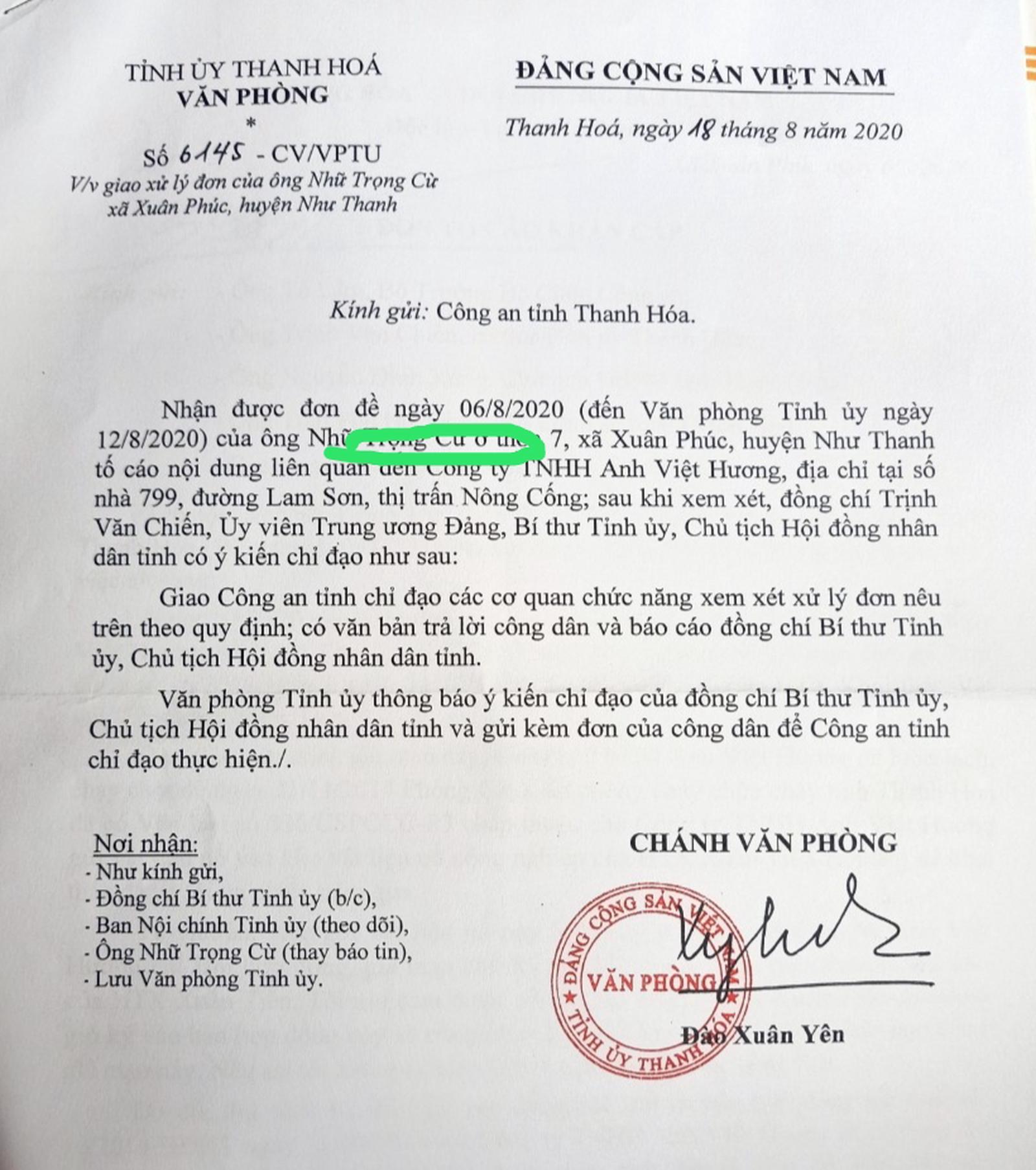 Văn bản truyền đạt ý kiến chỉ đạo của Bí thư Tỉnh ủy Thanh Hóa Trịnh Văn Chiến gửi Công an Thanh Hóa làm rõ đơn thư tố cáo của công dân, xử lý nghiêm minh theo quy định của pháp luật. Ảnh: Văn Thanh