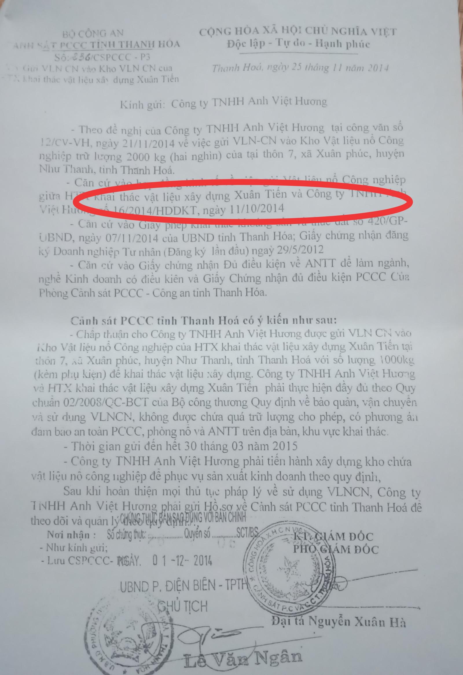 Văn bản chấp thuận của phòng cháy chữa cháy Thanh Hóa năm 2014 dựa trên hợp đồng bị tố cho là giả mạo để Công ty Anh Việt Hương gửi vật liệu nổ vào kho HTX Xuân Tiến cần được làm rõ. Ảnh: Văn Thanh