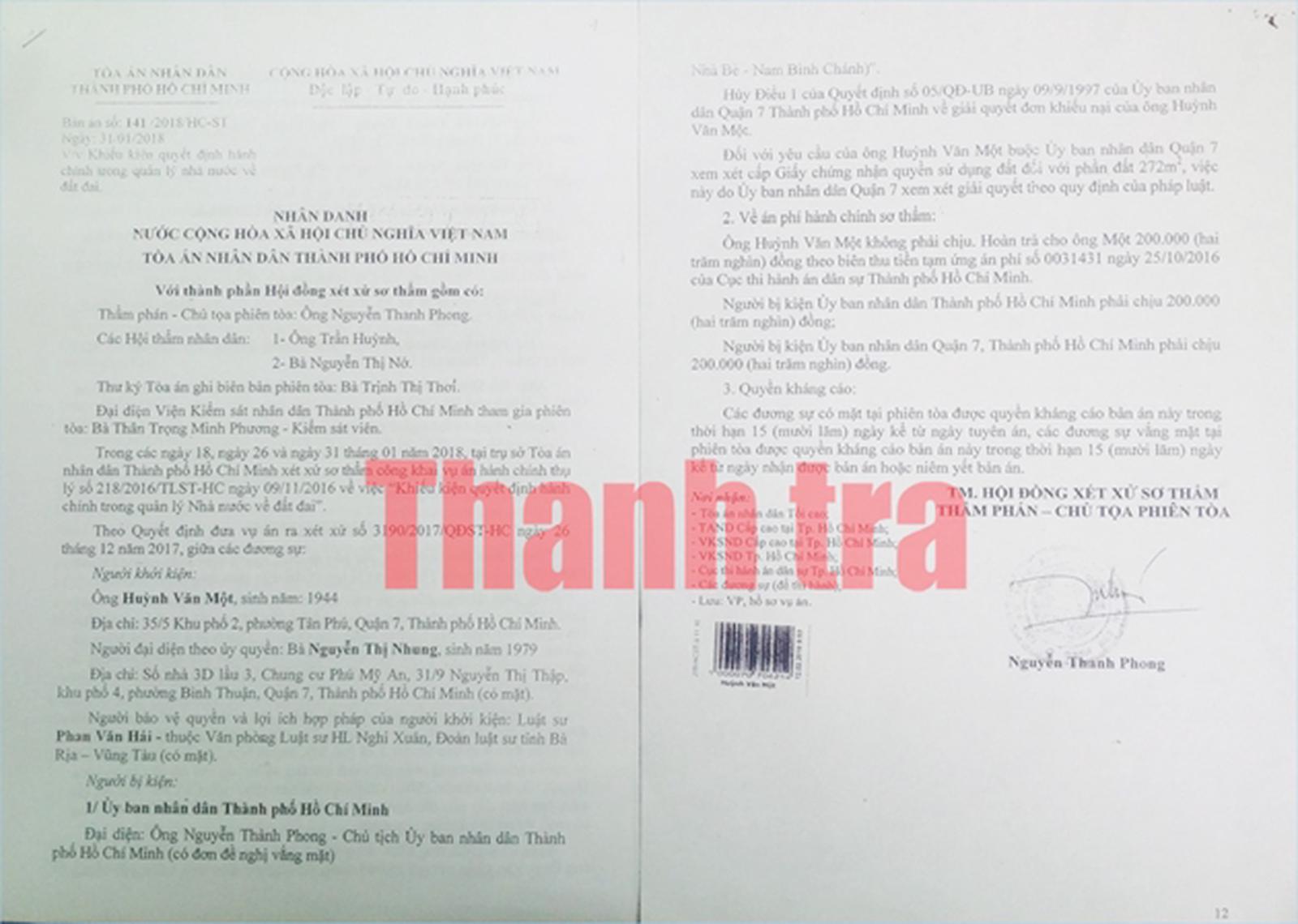 Bản án hành chính sơ thẩm số 141/2018/HC-ST ngày 31/1/2018 của TAND TP Hồ Chí Minh đã tuyên xử chấp nhận một phần khởi kiện của ông Huỳnh Văn Một; hủy một phần Điều 1 của Quyết định số 2272/QĐ-UB-NC ngày 28/4/1998 của UBND TP Hồ Chí Minh về việc giải quyết đơn của ông Huỳnh Văn Một; hủy Điều 1 của Quyết định số 05/QĐ-UB ngày 9/9/1997 của UBND quận 7 về giải quyết đơn khiếu nại của ông Một.
