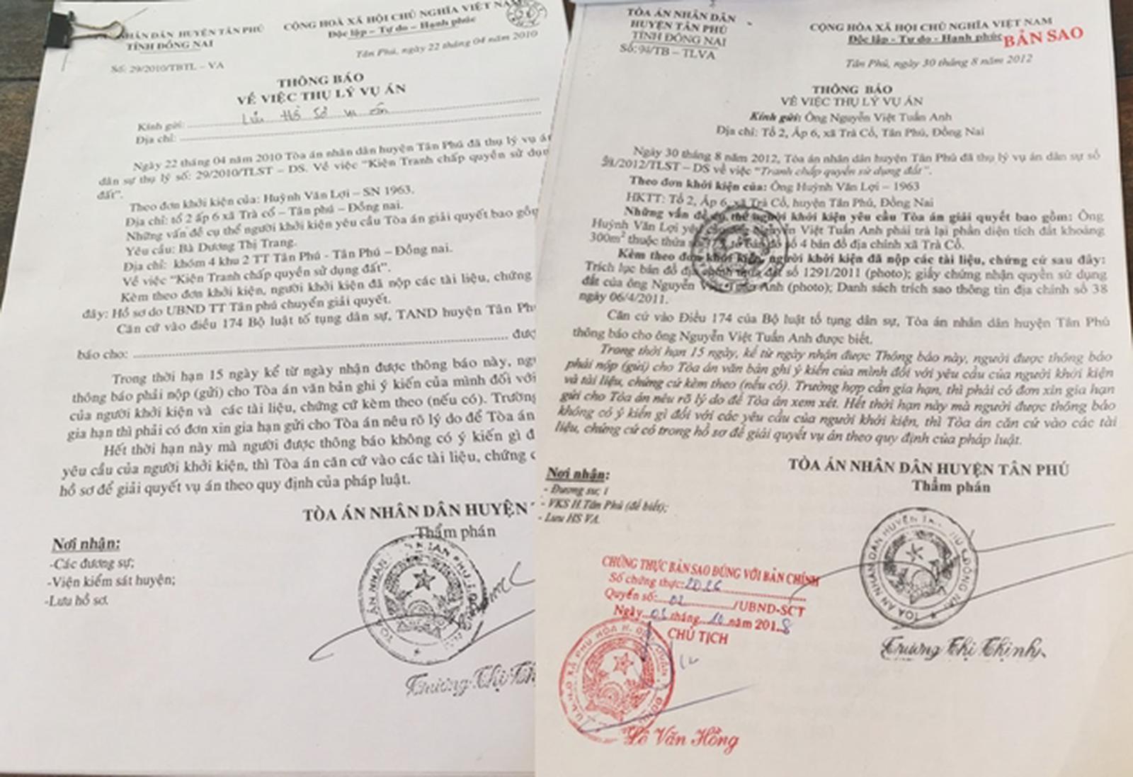 Ngày 30/8/2012, TAND huyện Tân Phú tiếp tục thụ lý vụ án dân sự số 94/2012/TLST-DS về “tranh chấp quyền sử dụng đất”. Trong vụ án này, nguyên đơn Huỳnh Văn Lợi yêu cầu ông Nguyễn Việt T.A. (trú tại ấp 6, xã Trà Cổ, huyện Tân Phú) phải trả lại phần diện tích đất khoảng 300m2 thuộc thửa số 373, tờ bản đồ số 4 bản đồ địa chính xã Trà Cổ.