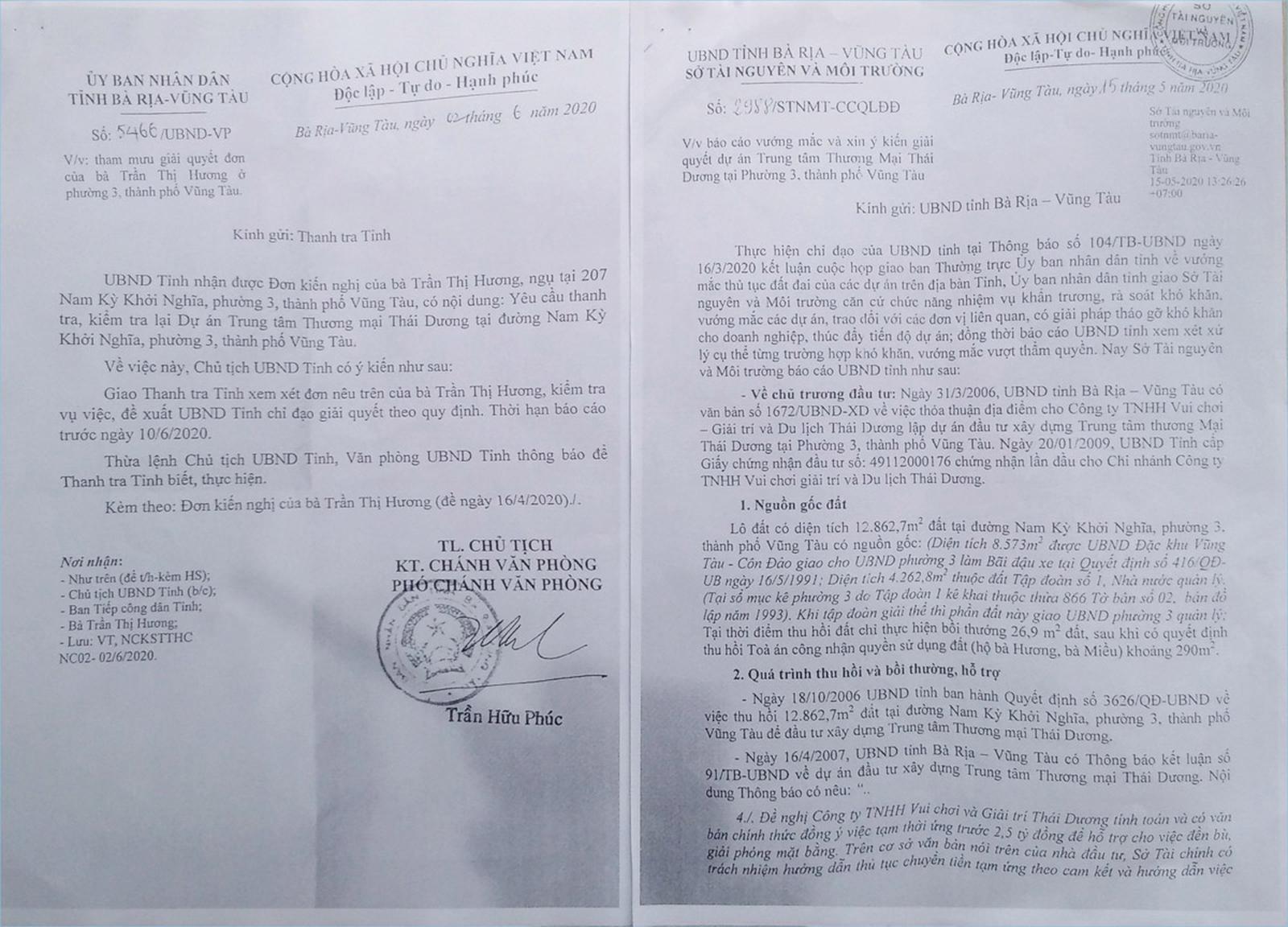 Văn bản số 5466/UBND-VP ngày 2/6/2020 của UBND tỉnh BR-VT gửi Thanh tra tỉnh về việc tham mưu giải quyết đơn của bà Trần Thị Hương thể hiện: “UBND tỉnh nhận được đơn kiến nghị của bà Trần Thị Hương, ngụ tại số 207 Nam Kỳ Khởi Nghĩa, phường 3, TP Vũng Tàu, có nội dung yêu cầu thanh tra, kiểm tra lại Dự án Trung tâm Thương mại Thái Dương tại đường Nam Kỳ Khởi Nghĩa, phường 3, TP Vũng Tàu”.