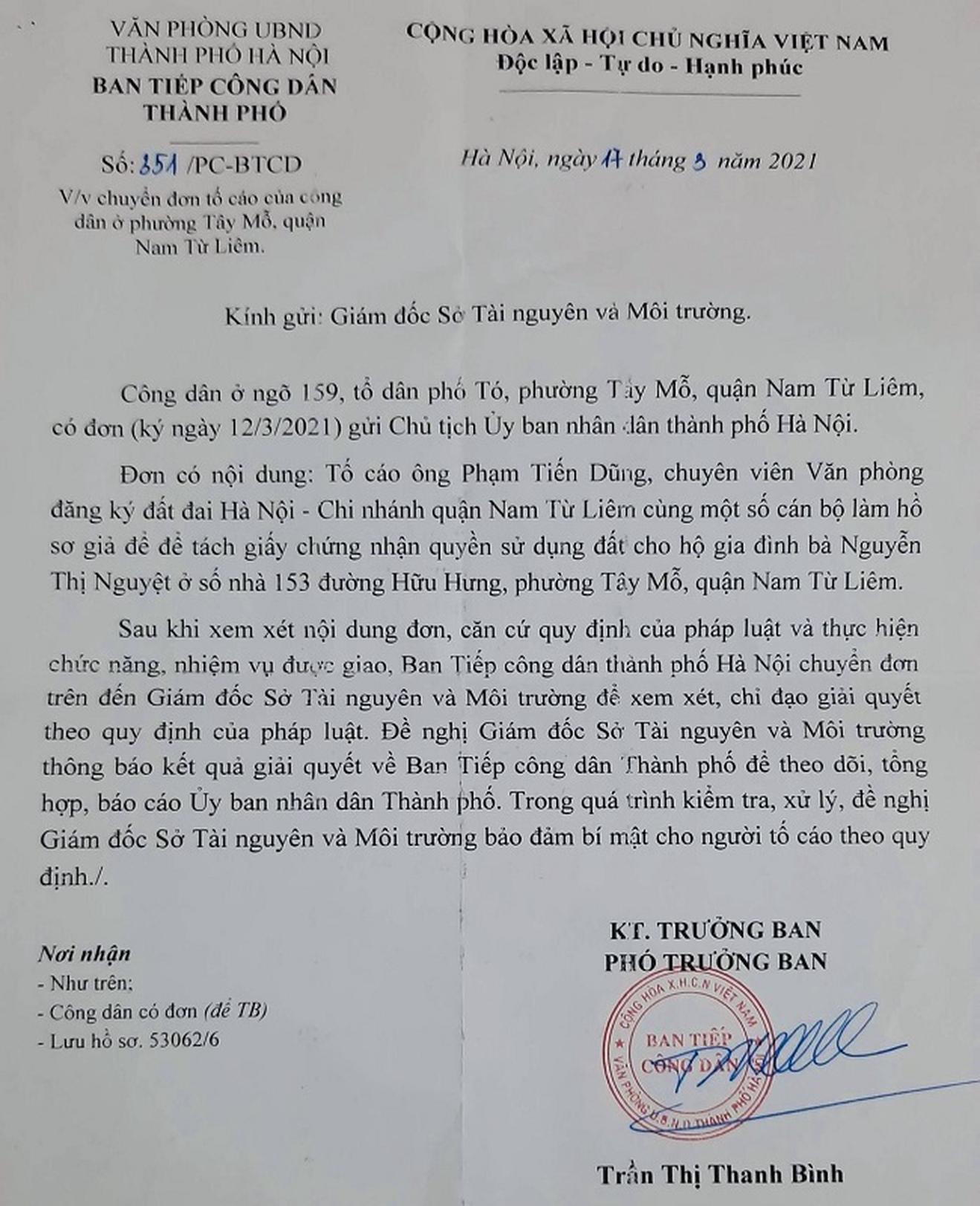 Nội dung văn bản cho thấy, công dân ở ngõ 159, tổ dân phố Tó, phường Tây Mỗ, quận Nam Từ Liêm có đơn (ký ngày 12/3/2021) gửi Chủ tịch UBND TP Hà Nội tố cáo ông Phạm Tiến Dũng, chuyên viên Văn phòng đăng ký đất đai Hà Nội – Chi nhánh quận Nam Từ Liêm cùng một số cán bộ làm hồ sơ giả để tách giấy chứng nhận quyền sử dụng đất (GCNQSDĐ) cho hộ gia đình bà Nguyễn Thị Nguyệt ở số nhà 153 đường Hữu Hưng, phường Tây Mỗ, quận Nam Từ Liêm.