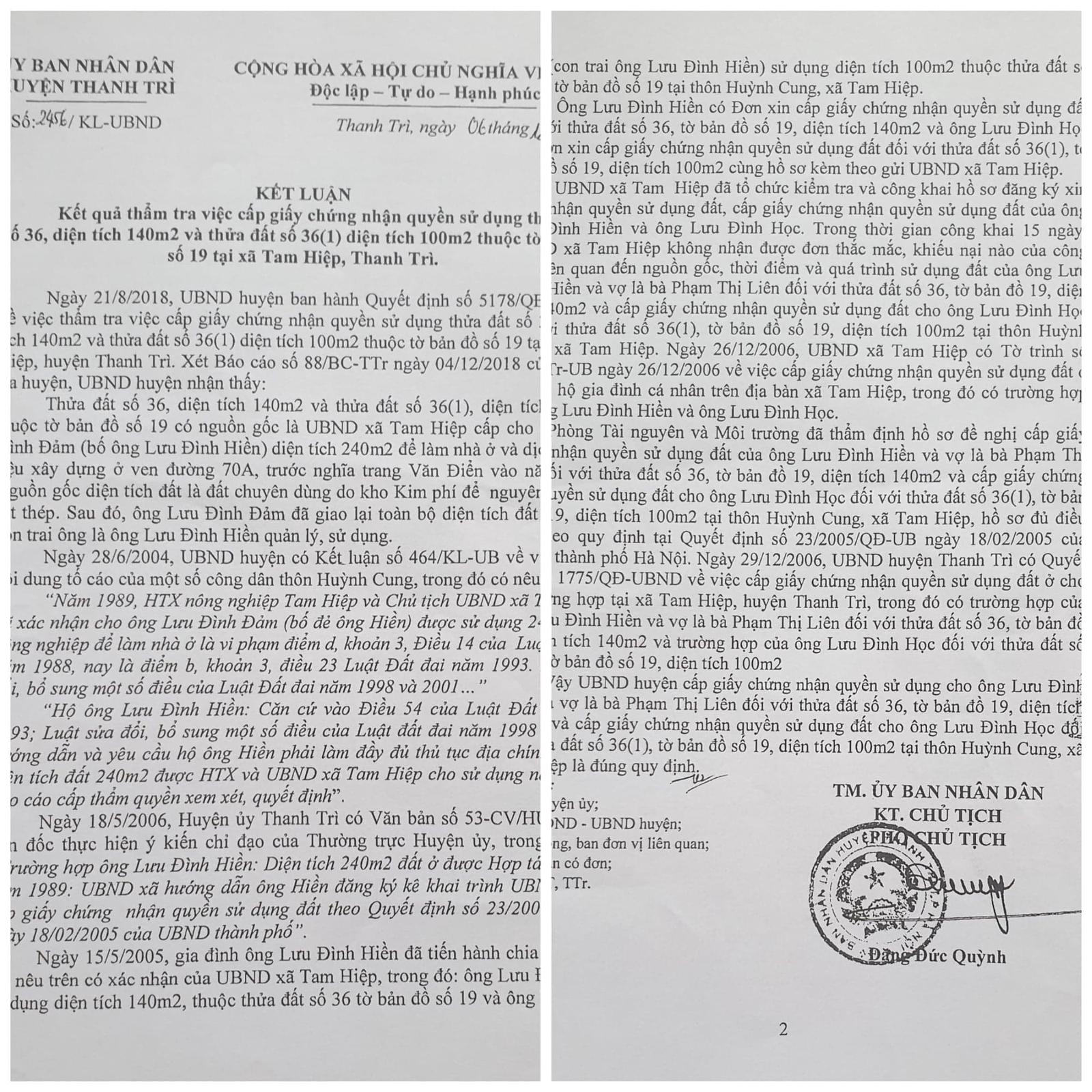 Tại Văn bản số 2456/KL-UBND, ông Đặng Đức Quỳnh kết luận: “Vậy UBND huyện cấp giấy chứng nhận quyền sử dụng cho ông Lưu Đình Hiền và vợ là bà Phạm Thị Liên đối với thửa đất số 36, tờ bản đồ 19, diện tích 140m2 và cấp giấy chứng nhận quyền sử dụng đất cho ông Lưu Đình Học đối với thửa đất số 36(1), tờ bản đồ số 19, diện tích 100m2 tại thôn Huỳnh Cung, xã Tam Hiệp là đúng pháp luật”.