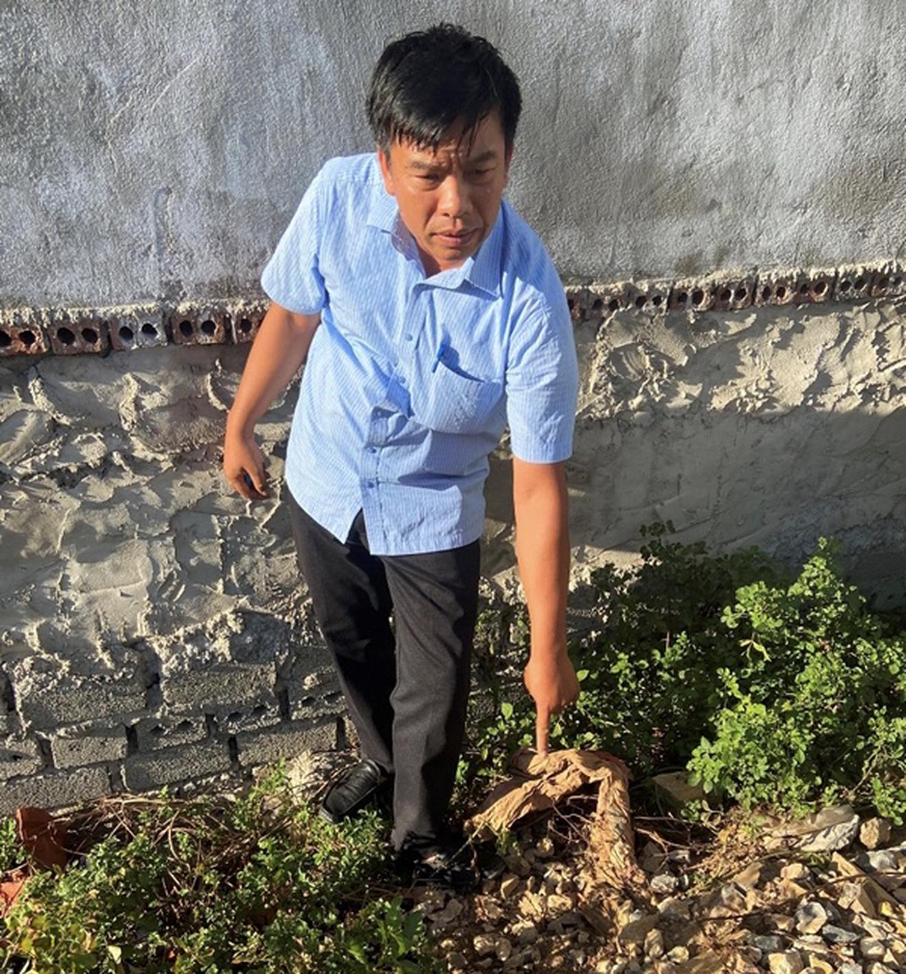 Ông Chu Văn Kế đang chỉ mốc giới của lô đất số 25 được cơ quan chức năng cắm bàn giao năm 2017 hiện vẫn còn. Ảnh: LP