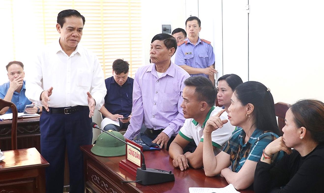 Chủ tịch UBND tỉnh Hà Tĩnh Võ Trọng Hải tiếp xúc, trao đổi với các hộ dân xã Kỳ Thượng, huyện Kỳ Anh liên quan kiến nghị về bồi thường, giải phóng mặt bằng công trình hồ chứa nước Rào Trổ. Ảnh: Thùy Dương/Báo Hà Tĩnh