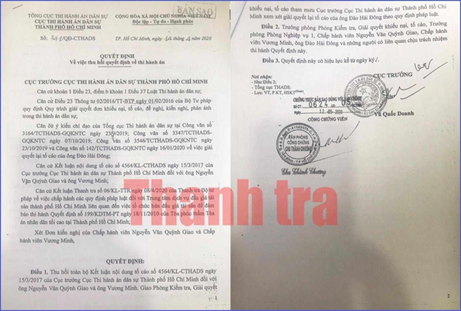 Tuy nhiên, đến ngày 14/4/2020 (hơn 3 năm sau ngày ban hành Kết luận nội dung tố cáo số 4564/KL-CTHADS), Cục THADS TP Hồ Chí Minh lại ra Quyết định số 341/QĐ-CTHADS, thu hồi toàn bộ Kết luận nội dung tố cáo số 4564/KL-CTHADS đối với ông Nguyễn Văn Quỳnh Giao và ông Vương Minh; giao Phòng Kiểm tra, giải quyết khiếu nại, tố cáo tham mưu Cục trưởng Cục THADS TP Hồ Chí Minh xem xét giải quyết lại tố cáo của người tố cáo.