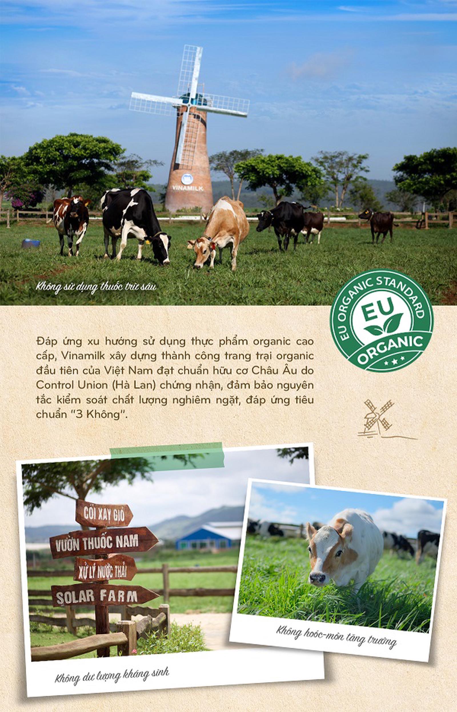 Trang trại Organic chuẩn Châu Âu: Để trang trại bò sữa được công nhận là trang trại hữu cơ đáp ứng tiêu chuẩn Châu Âu, toàn bộ quy trình chăm sóc và sản xuất sữa, nguyên liệu ở các trang trại đều phải tuân thủ nghiêm ngặt quy định “3 Không”: Không hoóc-môn tăng trưởng, không dư lượng thuốc kháng sinh, không thuốc trừ sâu.