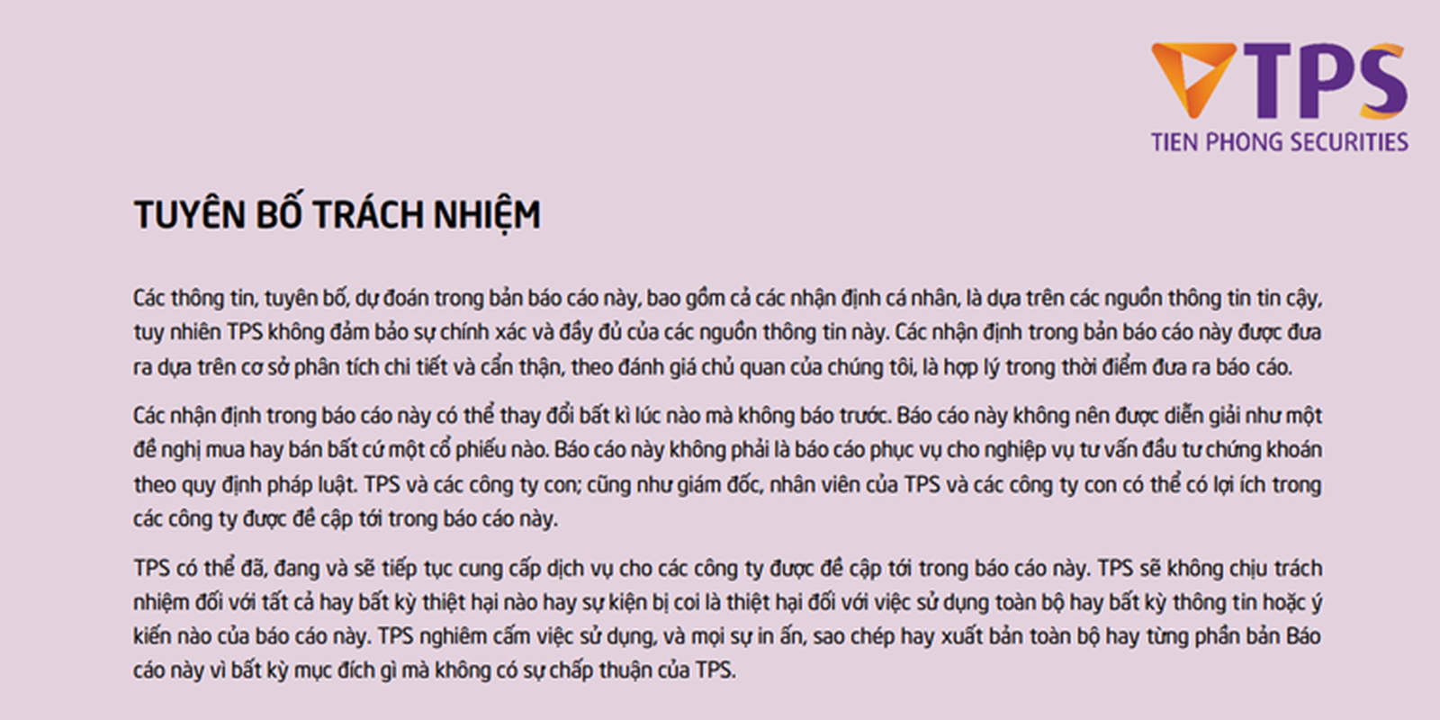 Báo cáo này không nên được diễn giải như một đề nghị mua hay bán bất cứ một cổ phiếu nào. Báo cáo này không phải là báo cáo phục vụ cho nghiệp vụ tư vấn đầu tư chứng khoán theo quy định pháp luật. TPS và các công ty con; cũng như giám đốc, nhân viên của TPS và các công ty con có thể có lợi ích trong các công ty được đề cập tới trong báo cáo này. TPS có thể đã, đang và sẽ tiếp tục cung cấp dịch vụ cho các công ty được đề cập tới trong báo cáo này. TPS sẽ không chịu trách nhiệm đối với tất cả hay bất kỳ thiệt hại nào hay sự kiện bị coi là thiệt hại đối với việc sử dụng toàn bộ hay bất kỳ thông tin hoặc ý kiến nào của báo cáo này. TPS nghiêm cấm việc sử dụng, và mọi sự in ấn, sao chép hay xuất bản toàn bộ hay từng phần bản Báo cáo này vì bất kỳ mục đích gì mà không có sự chấp thuận của TPS”.