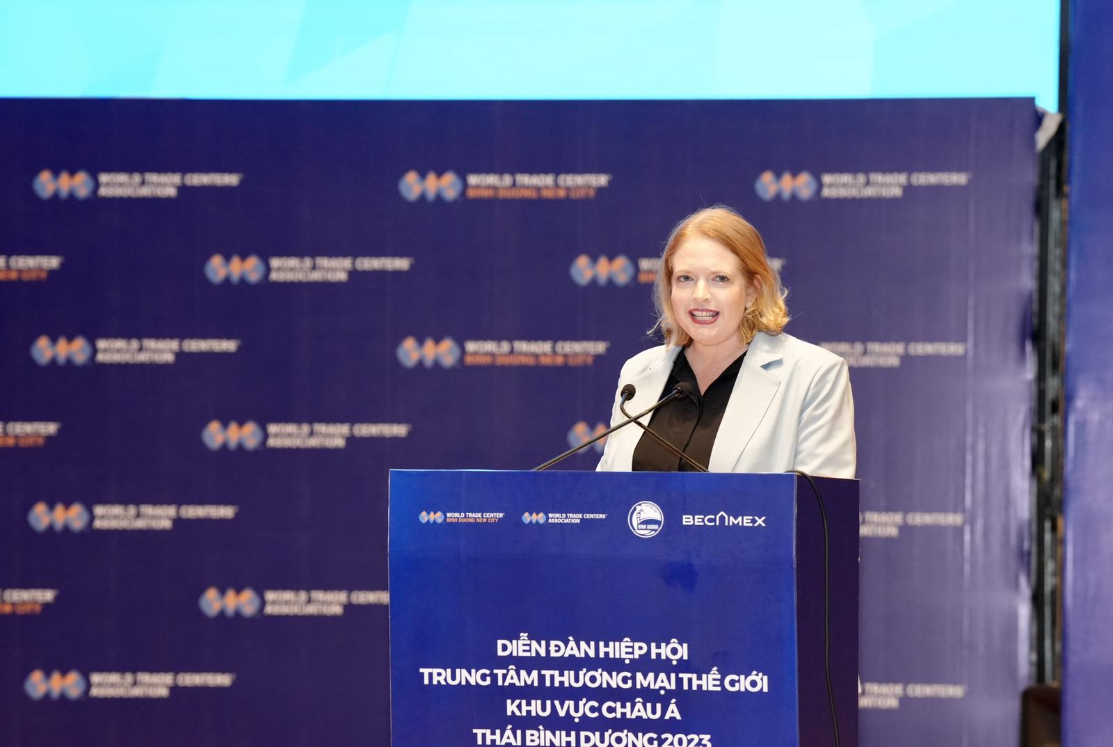bà Crystal Edn - Giám đốc, Dịch vụ thành viên Hiệp hội Trung tâm thương mại thế giới phát biểu tại diễn đàn