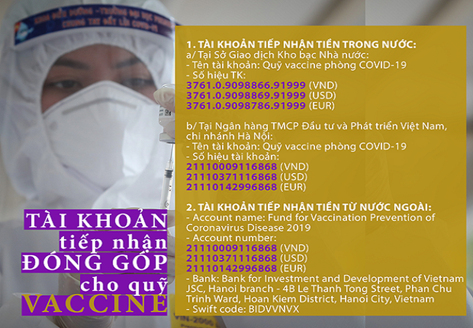 Ngân hàng Ngân hàng Thương mại Cổ phần Đầu tư và Phát triển Việt Nam - Chi nhánh Hà Nội 3 tài khoản tiếp nhận trong nước và nước ngoài: 21110009116868 (VND); 21110371116868 (USD); 21110142996868 (EUR).
