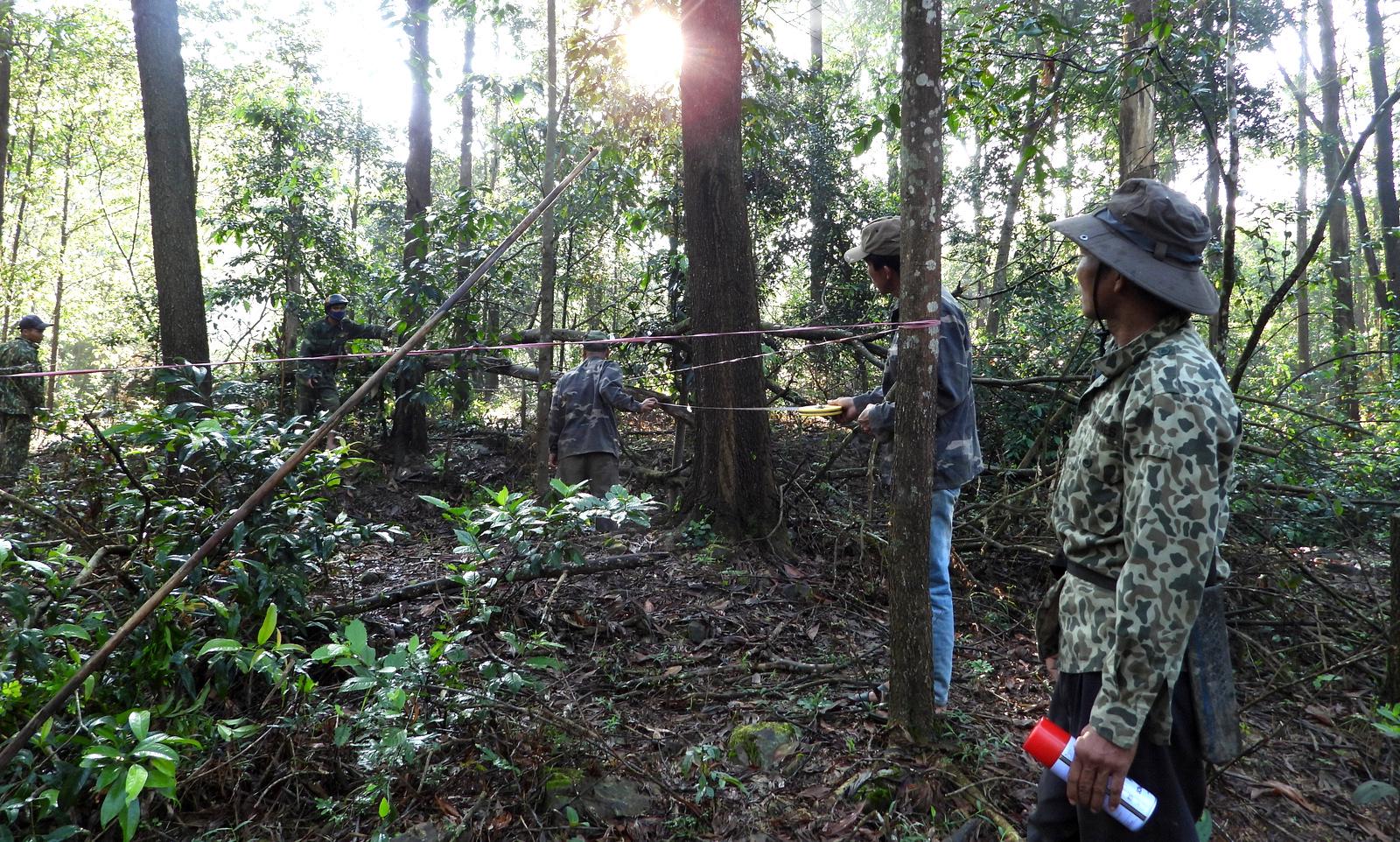 Các cán bộ KBT TN Đakrông đang khoanh vùng, kiểm đếm những diện tích cây keo bị gãy đổ, mục ruỗng. Ảnh: Minh Tân