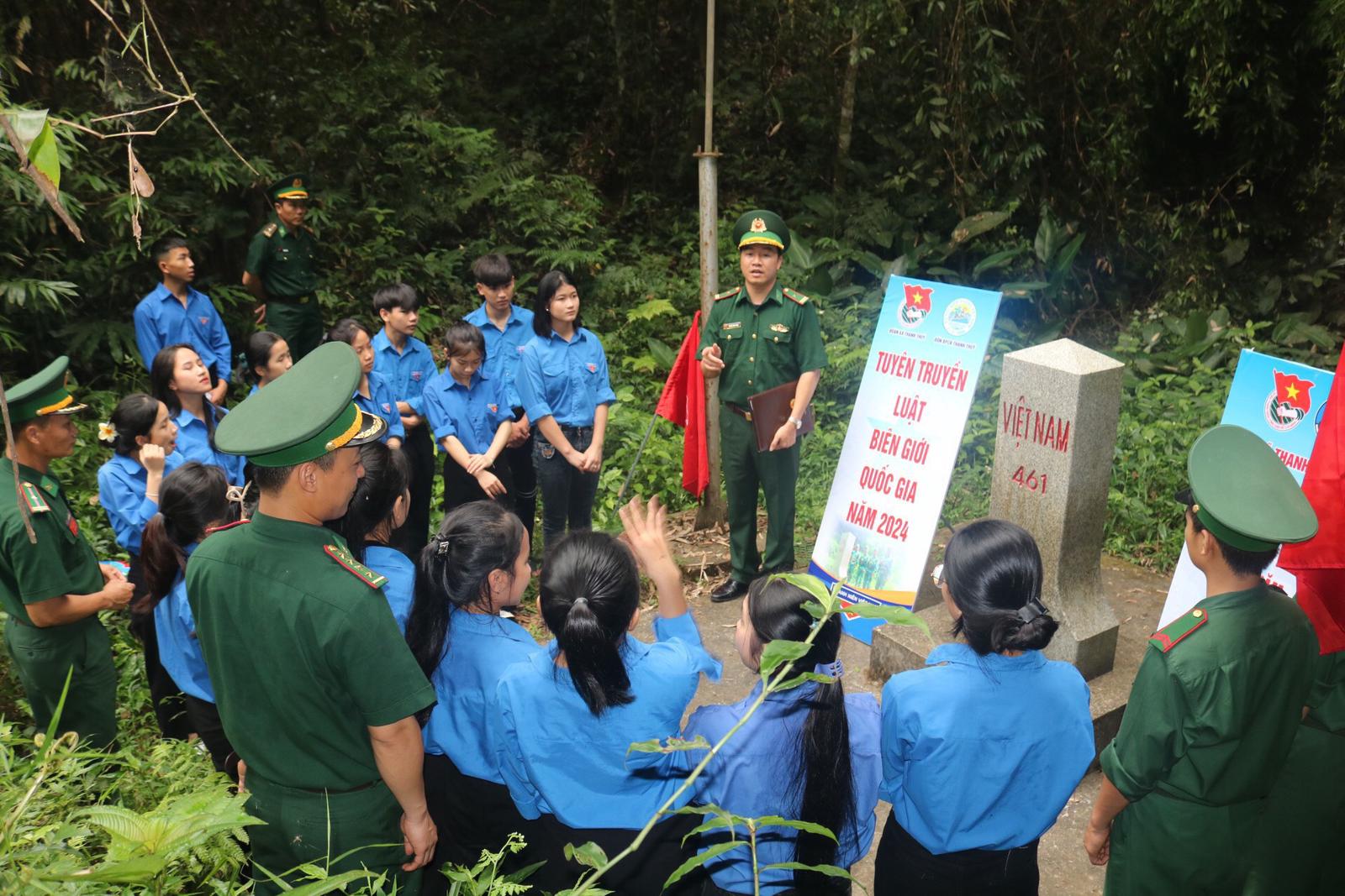 Cán bộ Đồn Biên phòng cửa khẩu Thanh Thuỷ, Bộ đội Biên phòng Nghệ An giới thiệu về mốc quốc giới tại cửa khẩu cho học sinh địa phương. Ảnh: Lê Thạch