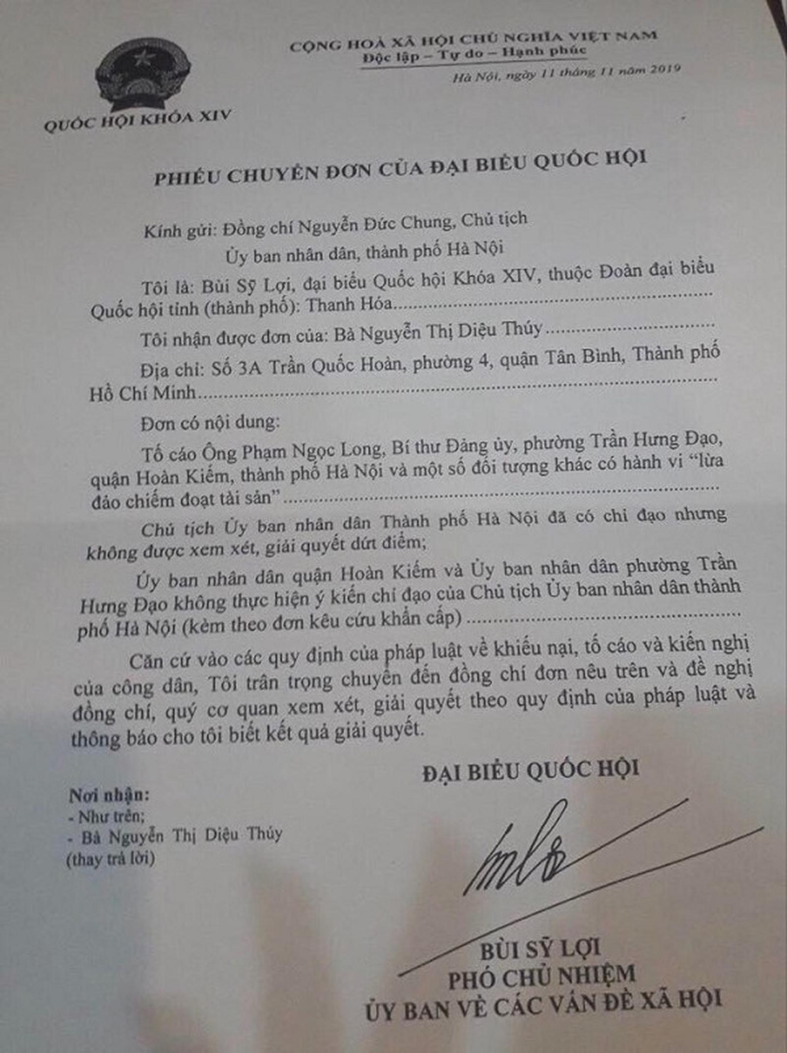Ngày 11/11/2019, ông Bùi Sỹ Lợi, Đại biểu Quốc hội Khóa XIV, Phó Chủ nhiệm Ủy ban về các vấn đề xã hội, thuộc Đoàn đại biểu Quốc hội tỉnh Thanh Hóa đã có phiếu chuyển đơn đến Bí thư Thành ủy TP Hà Nội và Chủ tịch UBND TP Hà Nội Nguyễn Đức Chung để được xem xét giải quyết dứt điểm. Thế nhưng, đến nay vụ việc vẫn chưa được các cơ quan chức năng giải quyết dứt điểm.