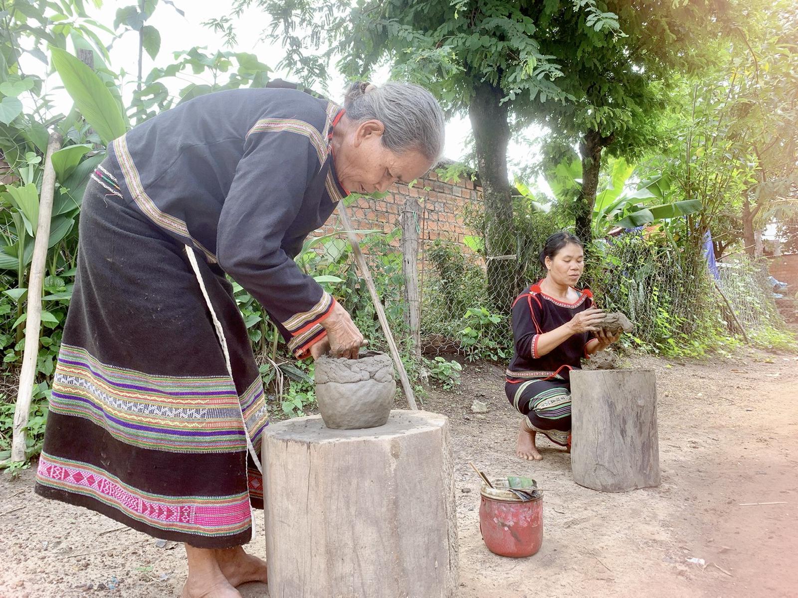 Nghệ nhân ở làng gốm cổ buôn Dơng Bắk (xã Yang Tao, huyện Lắk) tỉ mỉ tạo ra những sản phẩm gốm bằng cách làm thủ công, mang đậm giá trị văn hóa bản địa. Ảnh: TL
