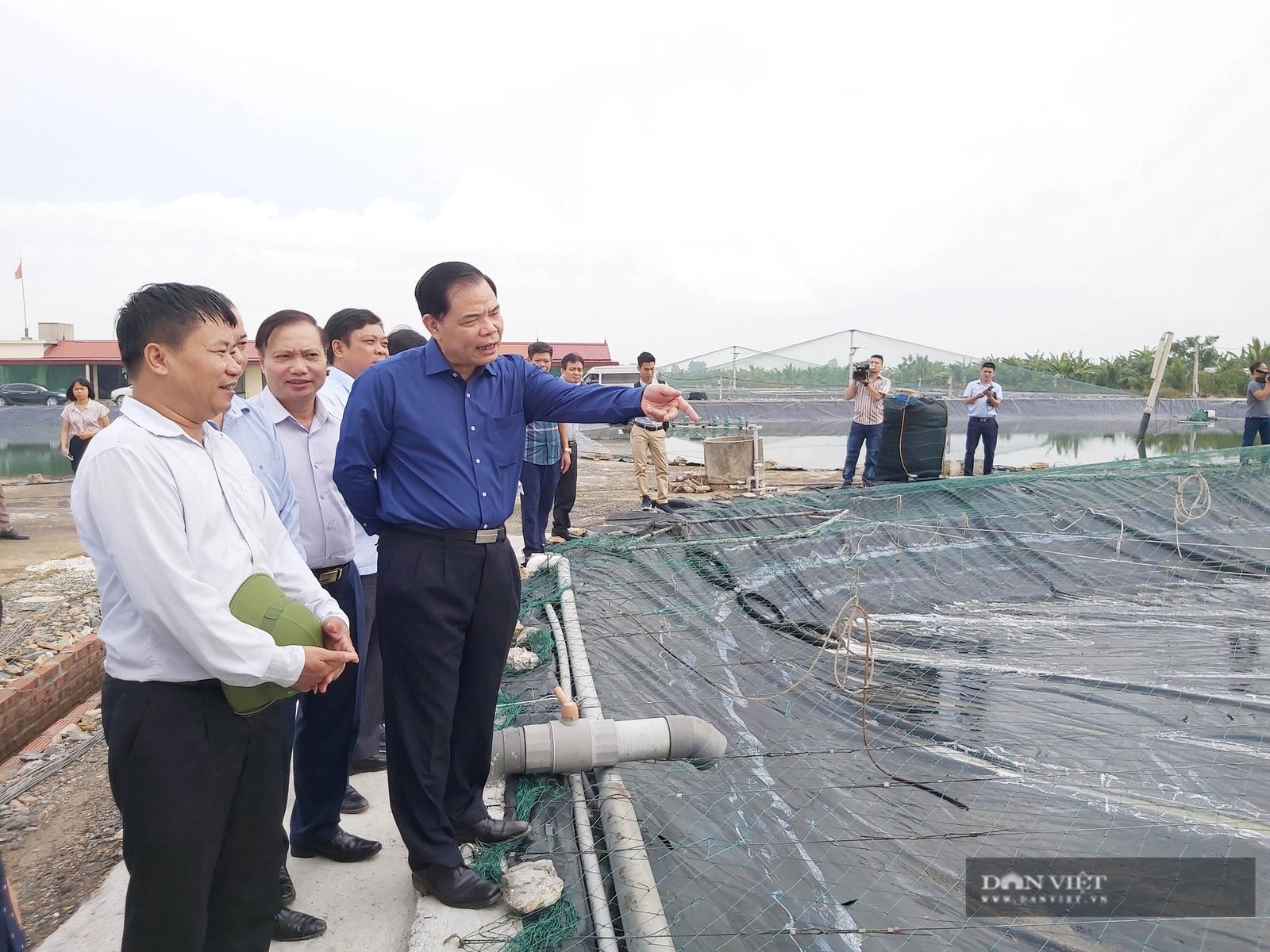 Bộ trưởng Nguyễn Xuân Cường thời điểm thăm gia đình ông Lê Ngọc Quyết, tại xã Kim Trung, huyện Kim Sơn với mô hình nuôi hàu, ngao giống, tôm khá hiệu quả. Nguồn: Danviet.vn