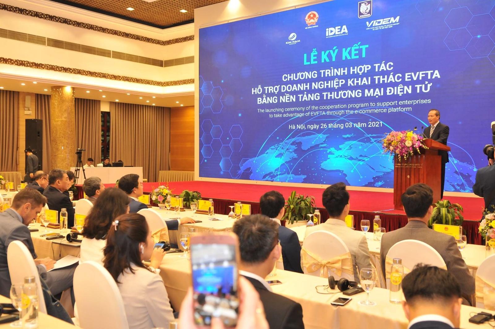 (Thanh tra) - Chiều ngày 26/3, tại Trung tâm Hội nghị Quốc tế ICC, Hà Nội đã diễn ra lễ ra mắt chương trình hợp tác hỗ trợ doanh nghiệp khai thác EVFTA (Hiệp định Thương mại tự do Việt Nam - Liên minh châu Âu) bằng nền tảng thương mại điện tử.
