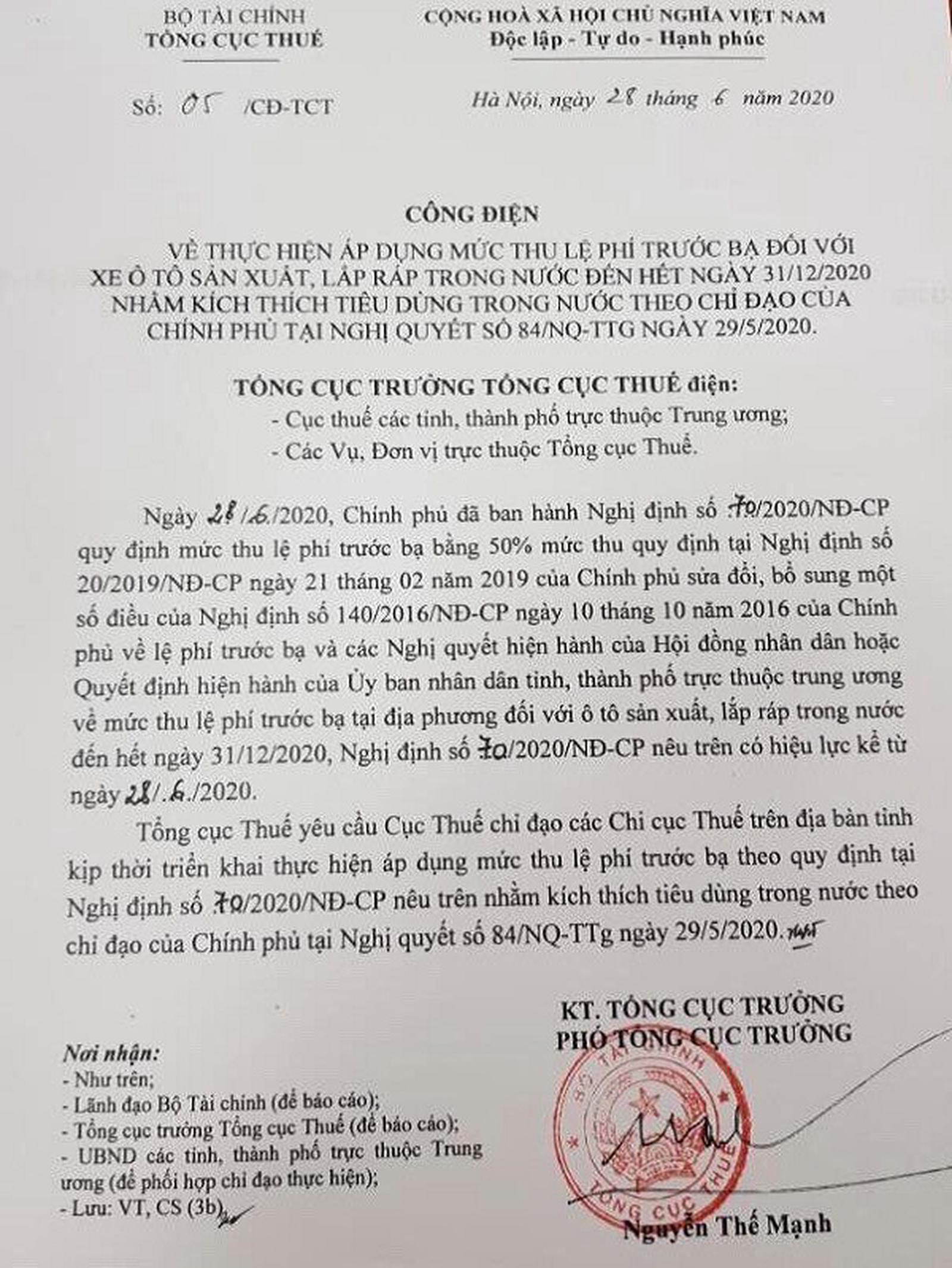 Tổng cục Thuế yêu cầu Cục Thuế chỉ đạo các chi cục thuế trên địa bàn tỉnh kịp thời triển khai thực hiện áp dụng mức thu lệ phí trước bạ theo quy định tại Nghị định 70 nằm kích thích tiêu dùng trong nước theo chỉ đạo của Chính phủ tại Nghị quyết 84/NQ-TTg ngày 29/5/2020.
