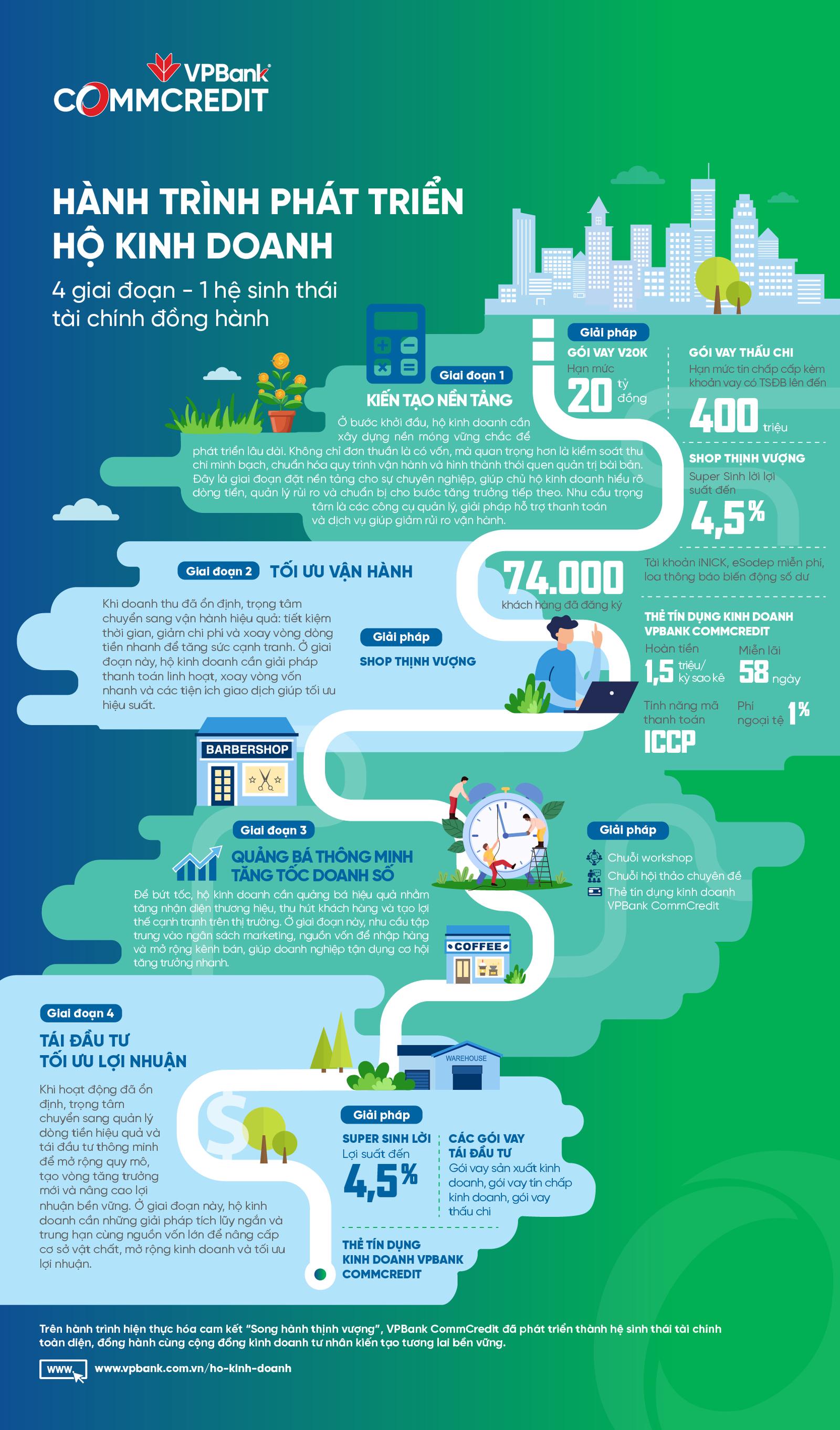 Với định hướng đó, VPBank CommCredit xây dựng trọn bộ giải pháp đồng hành cùng hộ kinh doanh qua bốn giai đoạn phát triển, hỗ trợ không chỉ ở thời điểm cần vốn mà còn trong suốt hành trình tối ưu và mở rộng kinh doanh. Đây cũng là cách ngân hàng hiện thực hóa cam kết “Song hành thịnh vượng” cùng cộng đồng kinh doanh tư nhân.