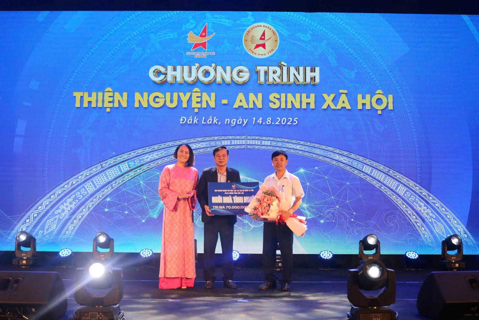 Đại diện lãnh đạo xã Ea Riêng nhận biểu trưng hỗ trợ xây dựng nhà tình nghĩa cho gia đình có hoàn cảnh khó khăn tại trên địa bàn xã do Hội Doanh nhân trẻ tỉnh Đắk Lắk trao tặng. Ảnh: HT