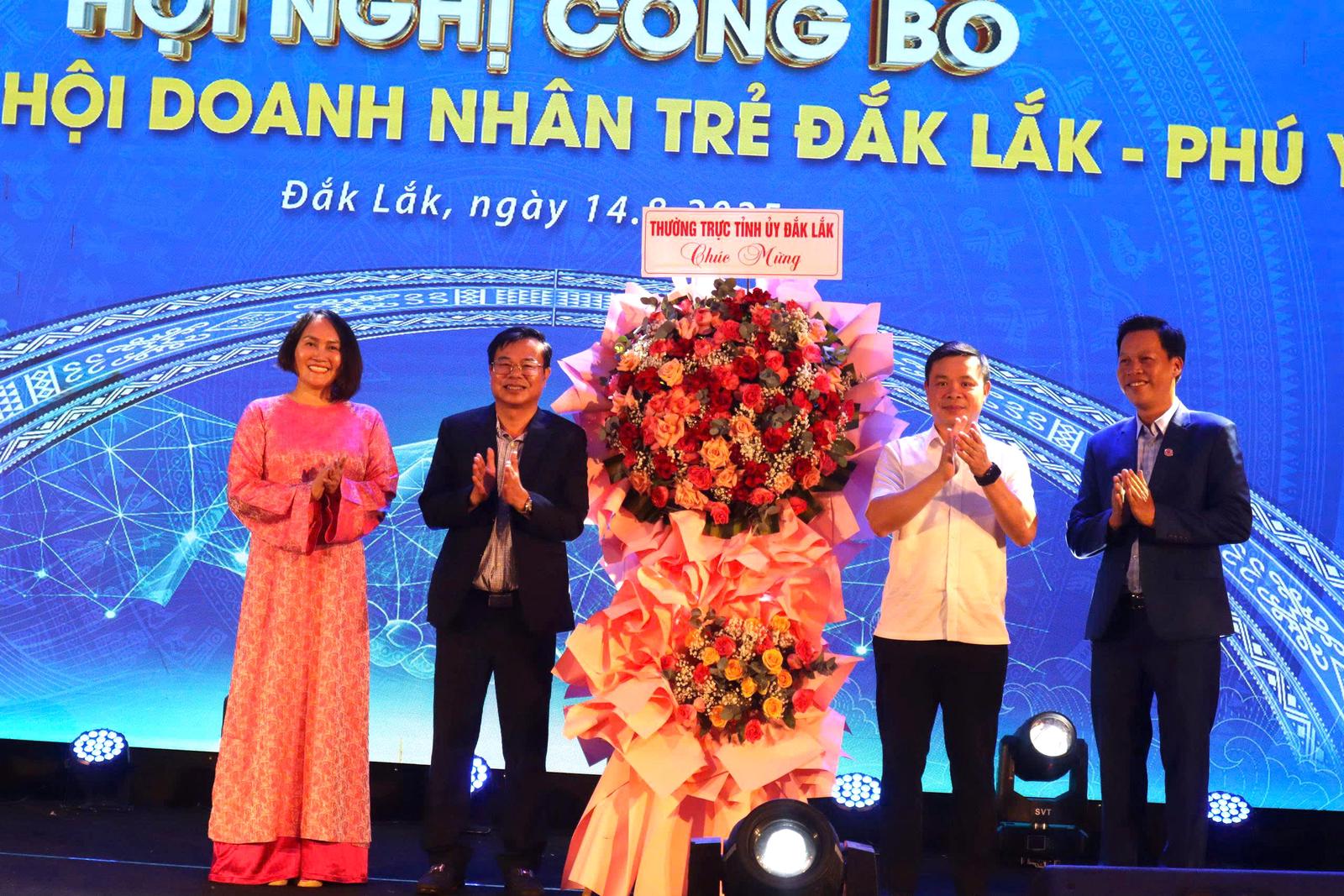 Đại diện lãnh đạo tỉnh Đắk Lắk và Hội Doanh nhân trẻ Việt Nam tặng hoa chúc mừng Ban Chấp hành mới. Ảnh: HT
