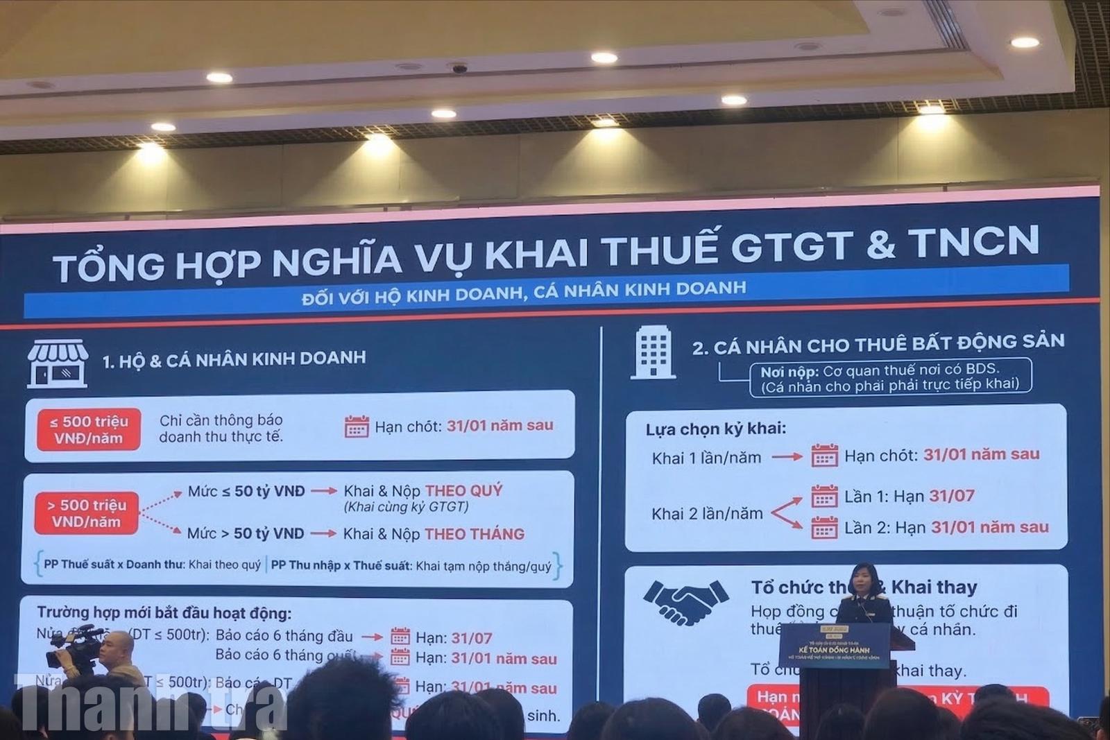 Về nghĩa vụ khai thuế, bà Chinh lưu ý các mốc thời gian quan trọng để tránh phát sinh sai sót: Hộ dưới ngưỡng 500 triệu chỉ cần thông báo doanh thu phát sinh trong năm trước ngày 31/1 năm sau; hộ trên ngưỡng 500 triệu, khai thuế GTGT theo quý (nếu doanh thu dưới 50 tỷ) hoặc theo tháng (nếu trên 50 tỷ); hộ mới ra kinh doanh, Có các mốc chốt chặn vào 31/7 và 31/1 tùy vào thời điểm bắt đầu hoạt động (6 tháng đầu năm hay cuối năm).