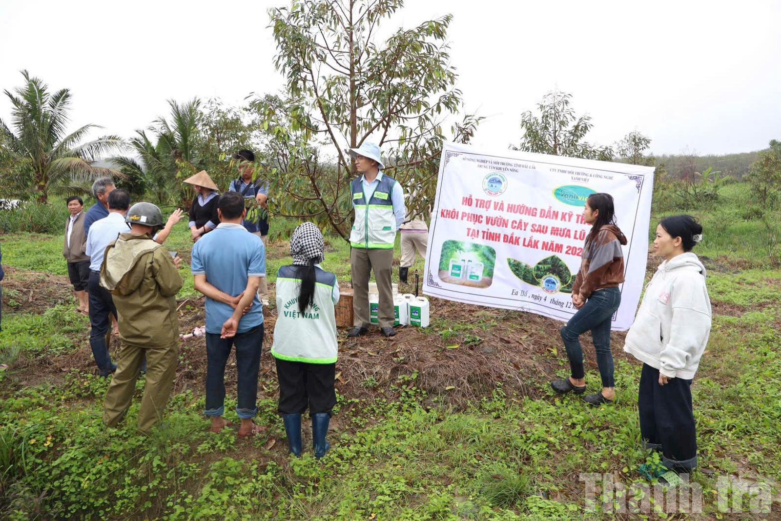 Cán bộ Trung tâm Khuyến nông tỉnh Đắk Lắk hỗ trợ và hướng dẫn kỹ thuật khôi phục vườn cây sau mưa lũ. Ảnh: NG