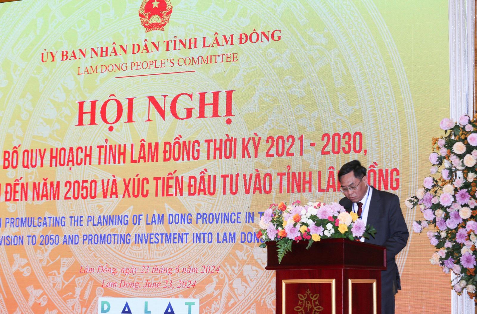 Phát biểu tại hội nghị, ông Võ Ngọc Hiệp, Phó Chủ tịch UBND tỉnh cho biết, tỉnh Lâm Đồng luôn nhận thức sâu sắc vai trò quan trọng cũng như tập trung cao cho công tác xây dựng quy hoạch tỉnh thời kỳ 2021 - 2030, tầm nhìn đến năm 2050. Hồ sơ quy hoạch tỉnh đã tổ chức lấy ý kiến của các bộ, ngành Trung ương, đã được Ban Thường vụ Tỉnh ủy, Hội đồng Nhân dân tỉnh thống nhất; UBND tỉnh tổ chức các hội nghị, hội thảo khoa học để lấy ý kiến các chuyên gia, các nhà khoa học và cộng đồng dân cư, các tổ chức và cá nhân theo quy định. Đến nay, quy hoạch tỉnh Lâm Đồng thời kỳ 2021 - 2030, tầm nhìn đến năm 2050 đã hoàn thành và được Thủ tướng Chính phủ phê duyệt tại Quyết định số 1727/QĐ-TTg ngày 29/12/2023.