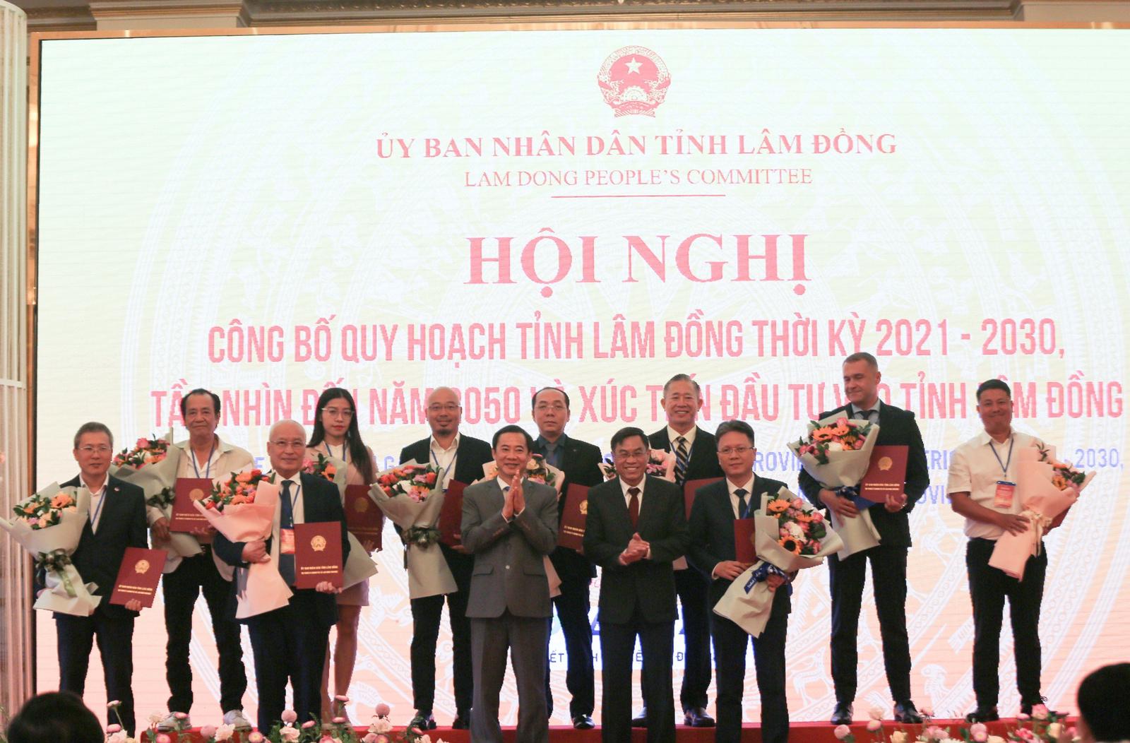 Lãnh đạo UBND tỉnh Lâm Đồng trao giấy chứng nhận, biên bản ghi nhớ cho các nhà đầu tư. Ảnh: Vũ Linh