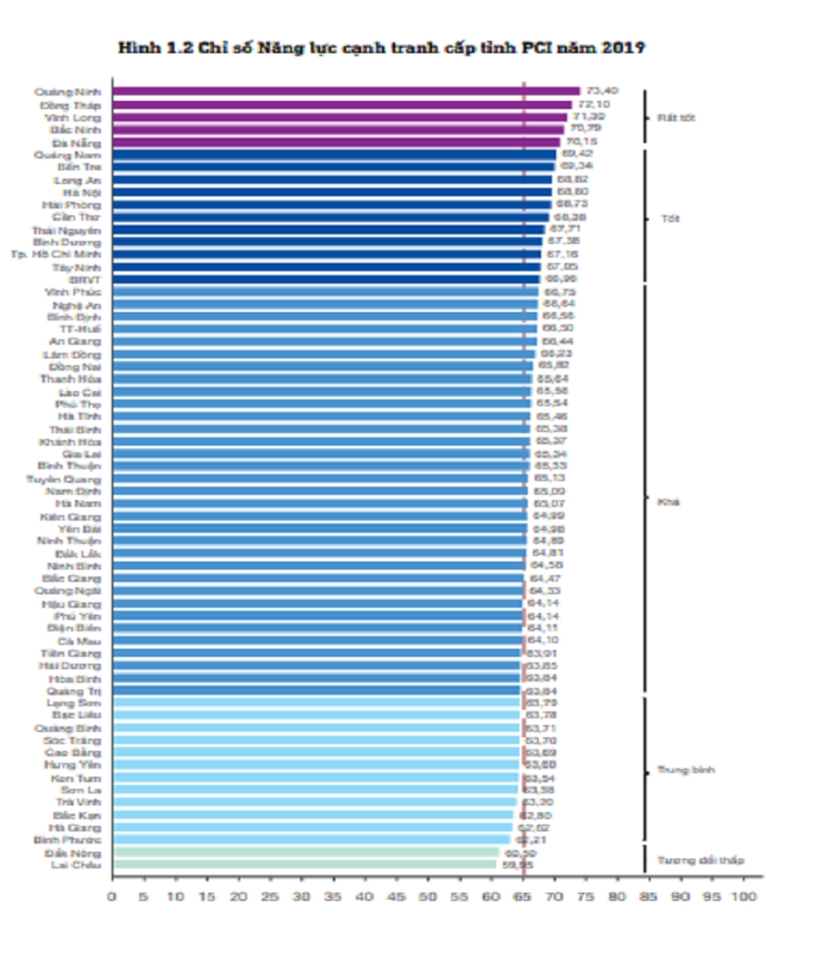 Nhóm cuối trong PCI 2019 là Lai Châu, Đắk Nông, Bình Phước, Hà Giang và Bắc Kạn. Điều tra PCI 2019 tiếp tục ghi nhận sự cải thiện nhanh chóng về điểm số của những tỉnh trong nhóm cuối bảng xếp hạng so với năm 2018. Nếu những tỉnh này tiếp tục duy trì tốc độ cải thiện như 2 năm vừa qua, rất có thể chúng ta sẽ chứng kiến những thay đổi lớn trong bảng xếp hạng PCI vào năm tới.