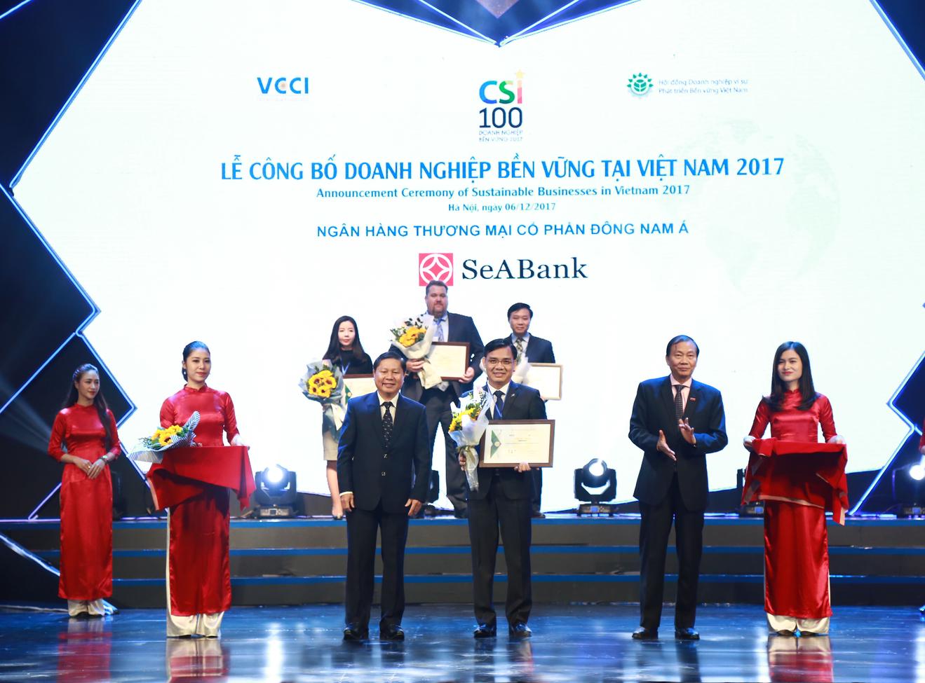 (Thanh tra)- Ngày 6/12/2017 tại Hà Nội, Ngân hàng TMCP Đông Nam Á (SeABank) vinh dự được trao danh hiệu Top 100 doanh nghiệp phát triển bền vững 2017. Danh hiệu này do Hội đồng Doanh nghiệp vì sự Phát triển Bền vững Việt Nam (VBCSD), thuộc Phòng Thương mại và Công nghiệp Việt Nam (VCCI) tổ chức và bình chọn. Danh sách này tôn vinh 100 doanh nghiệp thực hiện hoạt động CSR (trách nhiệm xã hội) tốt nhất Việt Nam trong năm qua.