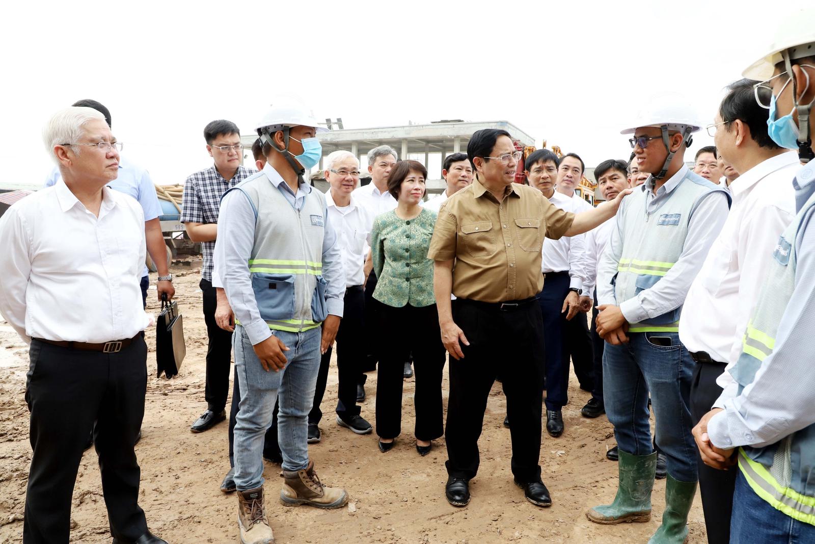 Thủ tướng khảo sát dự án xây dựng mở rộng nhà máy của Công ty TNHH PaiHong tại Khu công nghiệp Bàu Bàng, thăm hỏi động viên công nhân thi công trên công trường. Ảnh: A.X
