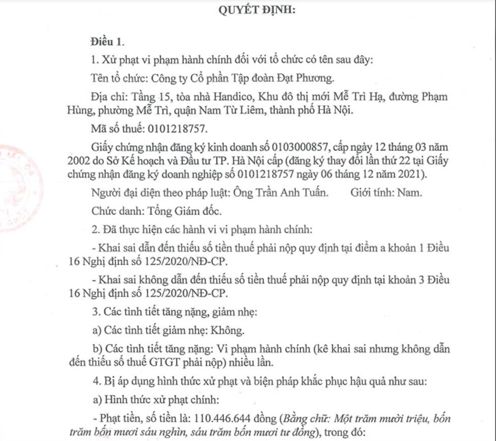 Quyết định xử phạt vi phạm hành chính về thuế đối với Tập đoàn Đạt Phương