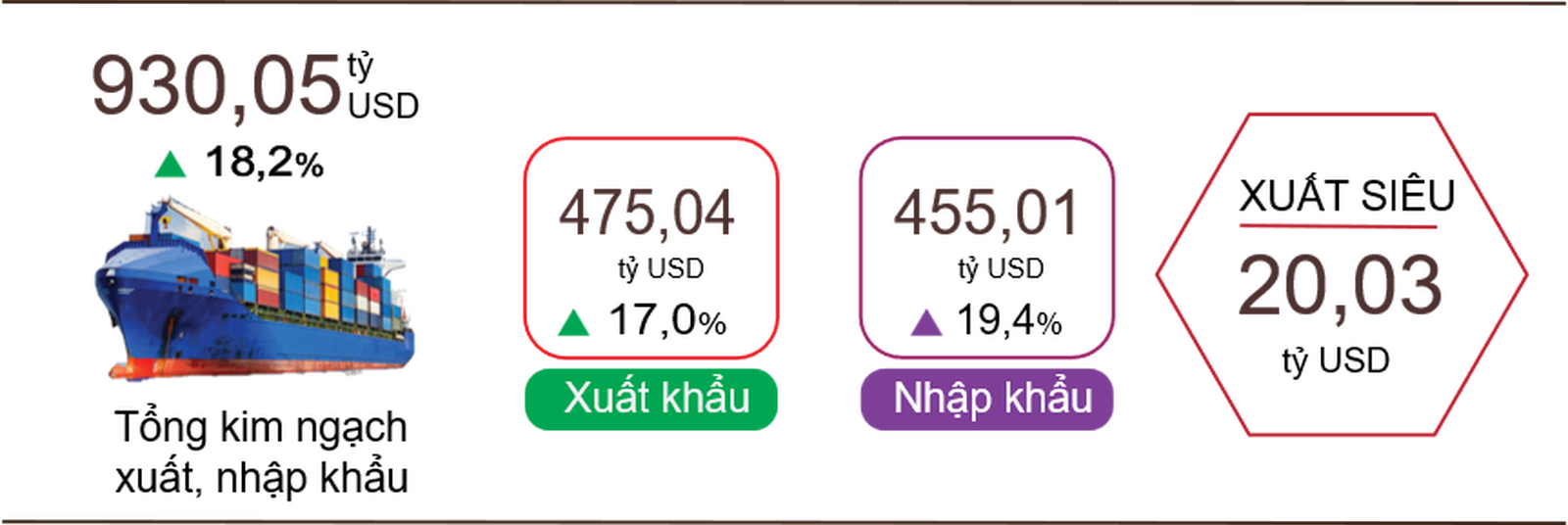 Trong đó, kim ngạch xuất khẩu hàng hóa ước đạt 475,04 tỷ USD, tăng 17,0%; nhập khẩu hàng hóa đạt 455,01 tỷ USD, tăng 19,4%. Cán cân thương mại tiếp tục duy trì trạng thái tích cực với mức xuất siêu 20,03 tỷ USD. Kết quả này không chỉ giúp ổn định các chỉ số vĩ mô như tỷ giá và ngoại hối, mà còn khẳng định Việt Nam là một "mắt xích" ngày càng quan trọng, không thể thay thế trong mạng lưới giao thương toàn cầu.