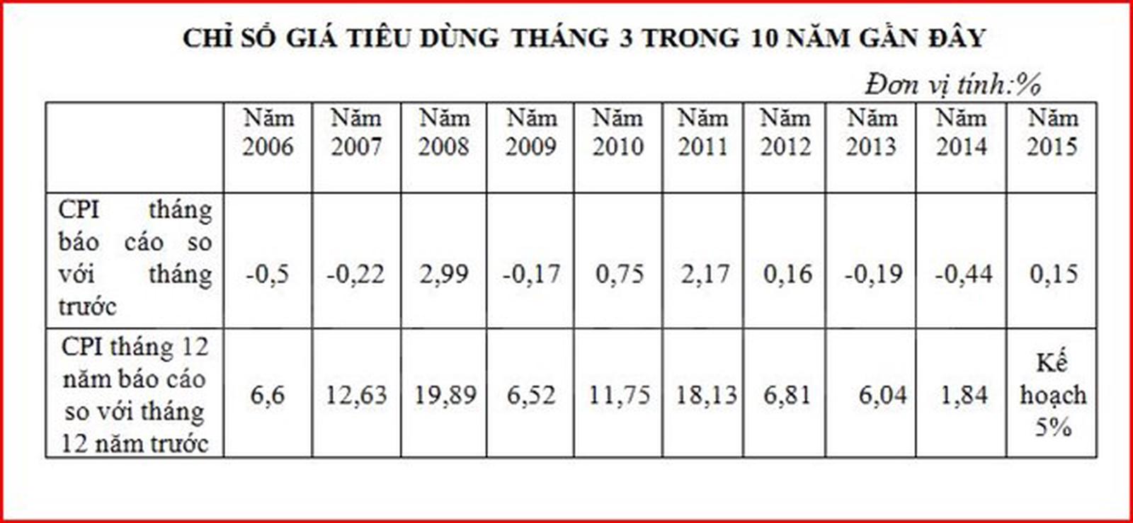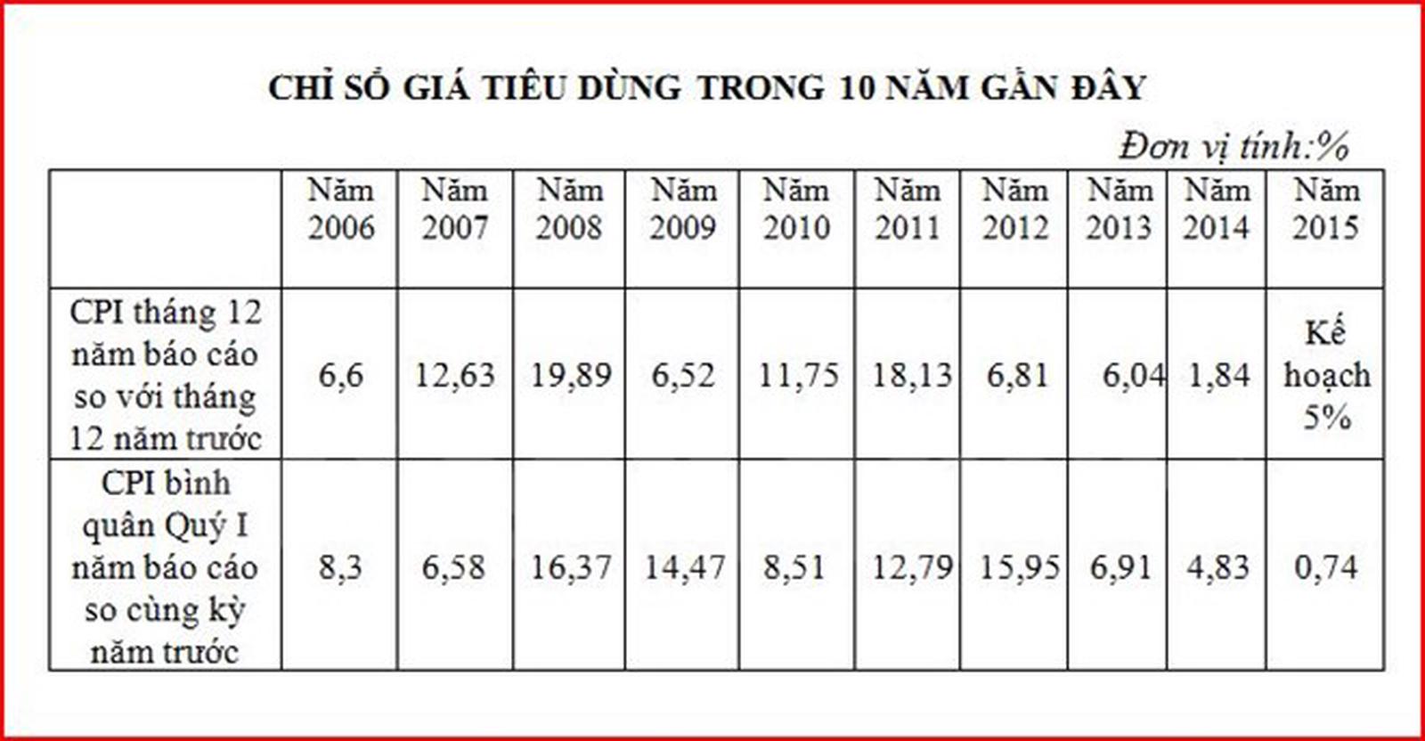 Cũng theo Báo cáo, tổng quân CPI bình quân quý I so cùng kỳ năm 2014 đã tăng 0,74%, thống kế cho thấy CPI quý I có tốc độ tăng tương đối thấp trong khoảng 10 năm gần đây. Chỉ số CPI tháng Một và Hai đều có mức giảm, tháng Ba tăng nhẹ, theo đó CPI bình quân mỗi tháng trong quý I có mức giảm nhẹ 0,03%./.