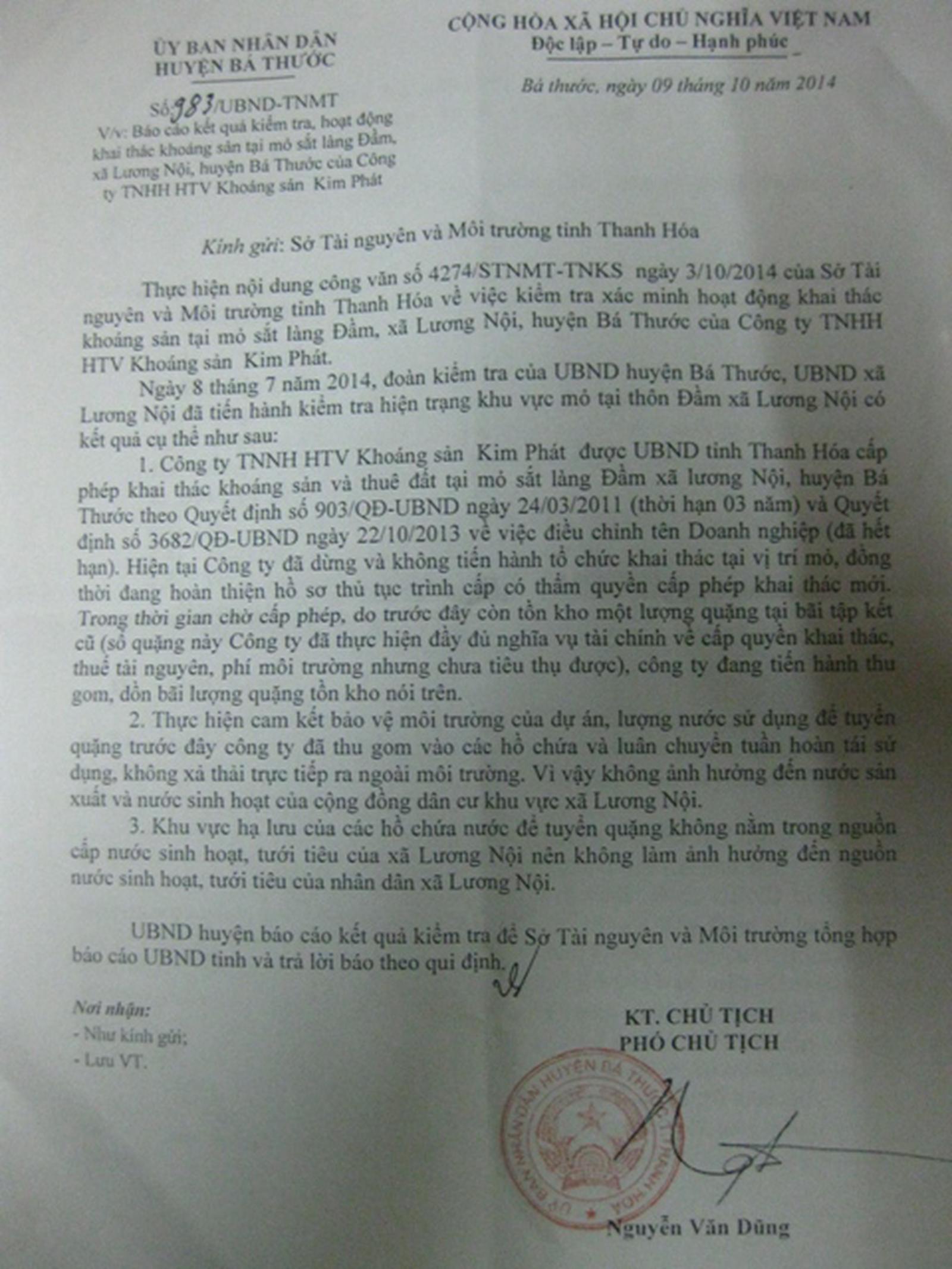 Cụ thể, Cty Kim Phát được UBND tỉnh Thanh Hóa cấp phép khai thác khoáng sản và thuê đất tại mỏ sắt làng Đầm, xã Lương Nội, huyện Bá Thước theo Quyết định số 903/QĐ-UBND ngày 14/3/2011 (thời hạn 3 năm) và Quyết định số 3682/QĐ-UBND ngày 22/10/2013 về việc điều chỉnh tên doanh nghiệp (đã hết hạn). Hiện tại, Cty Kim Phát đã dừng và không tiến hành tổ chức khai thác tại vị trí mỏ, đồng thời đang hoàn thiện hồ sơ chờ cấp phép, do trước đây còn tồn kho một lượng quặng tại bãi tập kết cũ. Số quặng này Cty đã thực hiện đầy đủ nghĩa vụ tài chính về cấp quyền khai thác, thuế tài nguyên, phí môi trường nhưng chưa được tiêu thụ. Hiện nay, Cty đang tiến hành thu gom, dồn bãi lượng quặng tồn kho nói trên.