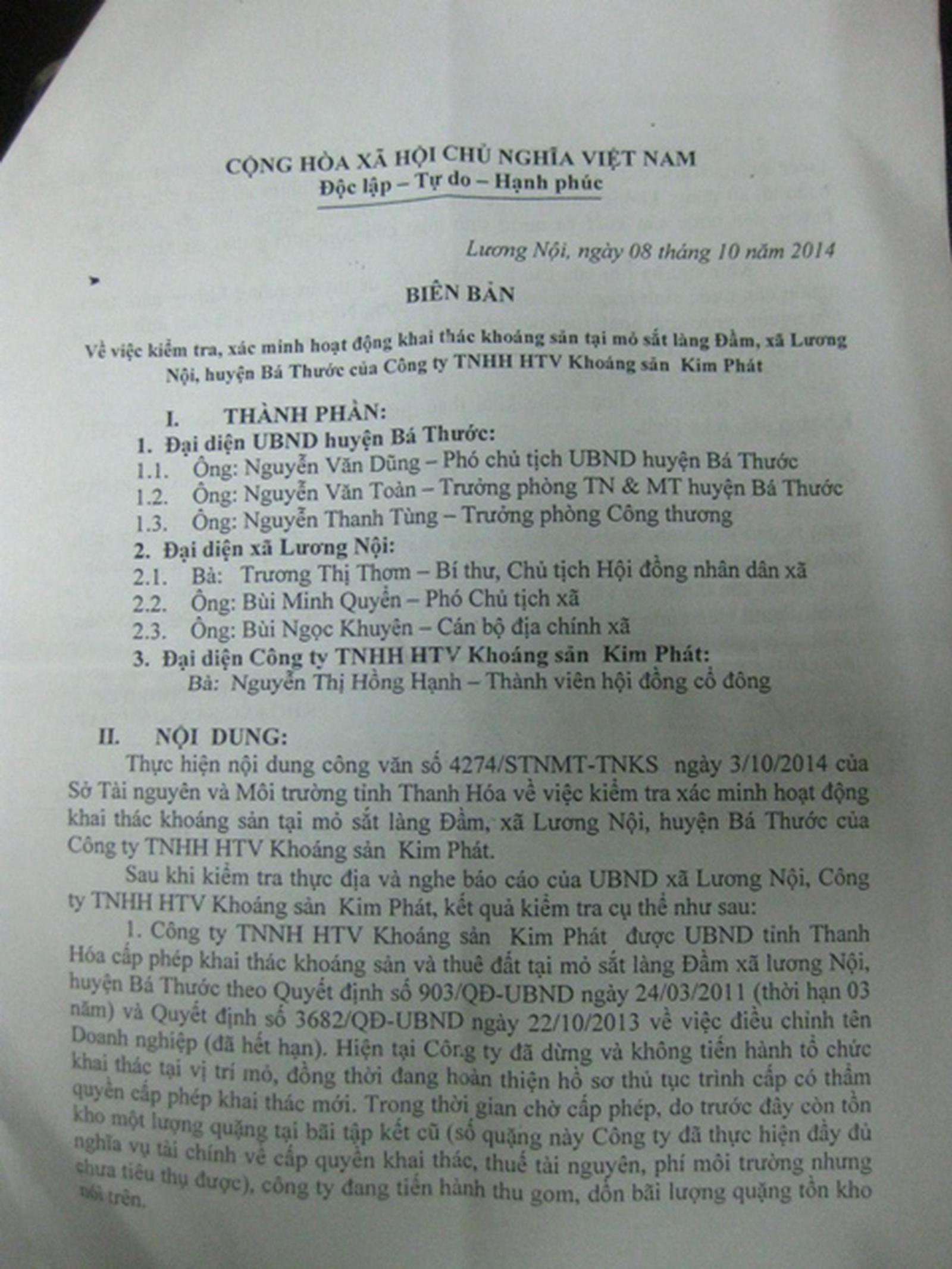 Biên bản kiểm tra theo sự chỉ đạo của Sở Tài nguyên và Môi trường Thanh Hóa. Ảnh: Văn Thanh