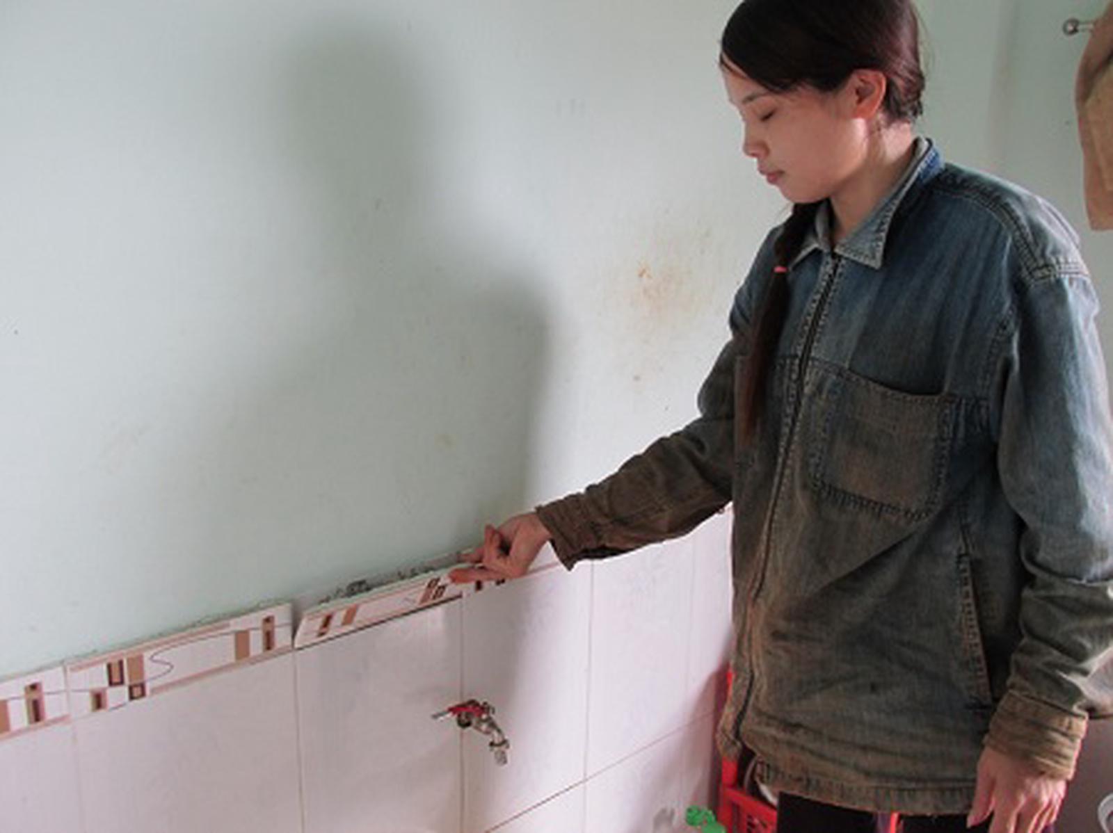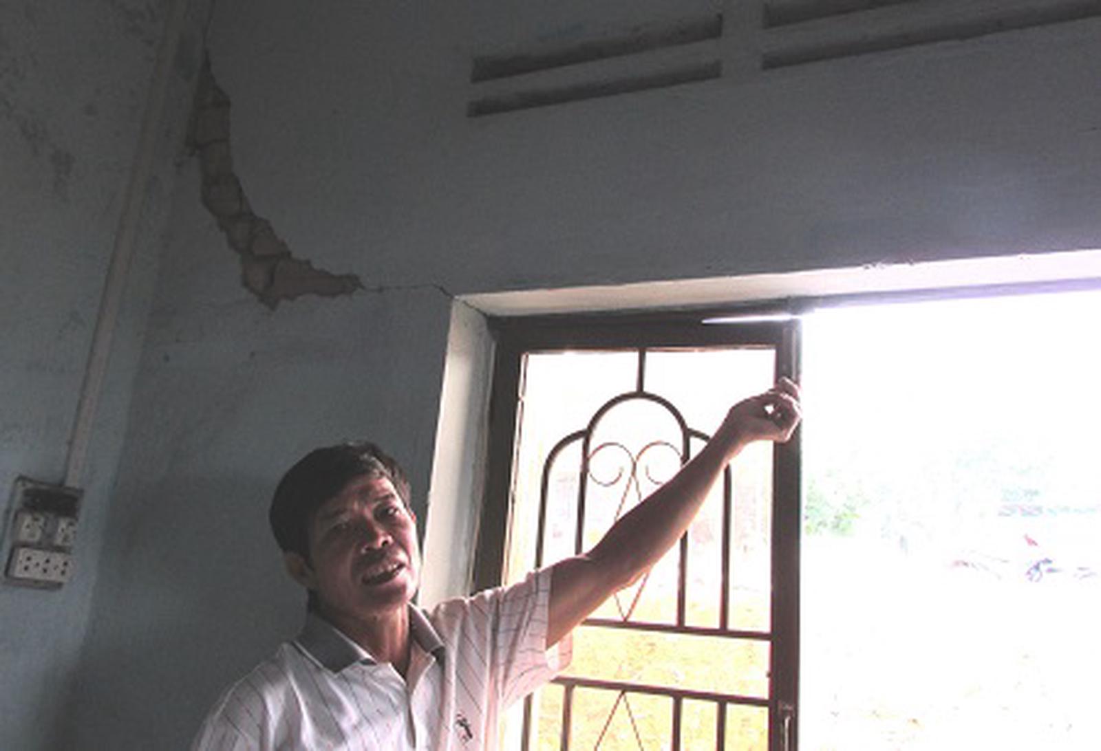 ẢNhà dân bị nứt, gạch ốp tường bị bung ra. Ảnh: Trung Đức