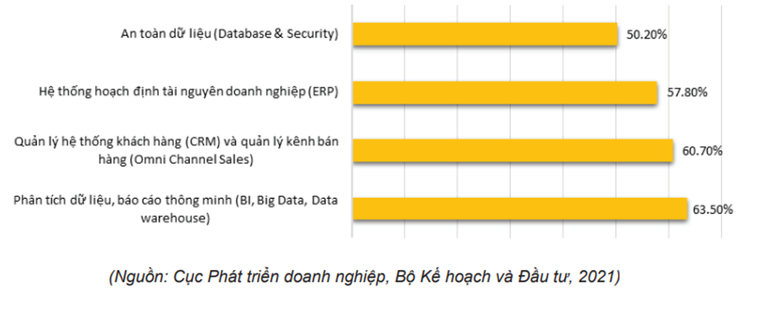 60,7% tổng số doanh nghiệp khảo sát có nhu cầu về giải pháp về quản lý hệ thống khách hàng (CRM) và quản lý kênh bán hàng (Omni Channel Sales). Hai giải pháp còn lại bao gồm Hệ thống hoạch định tài nguyên doanh nhiệp (ERP) và An toàn dữ liệu (Database & Security) có nhu cầu tương đương nhau với lần lượt 57,8% và 50,2% số doanh nghiệp tham gia khảo sát lựa chọn.