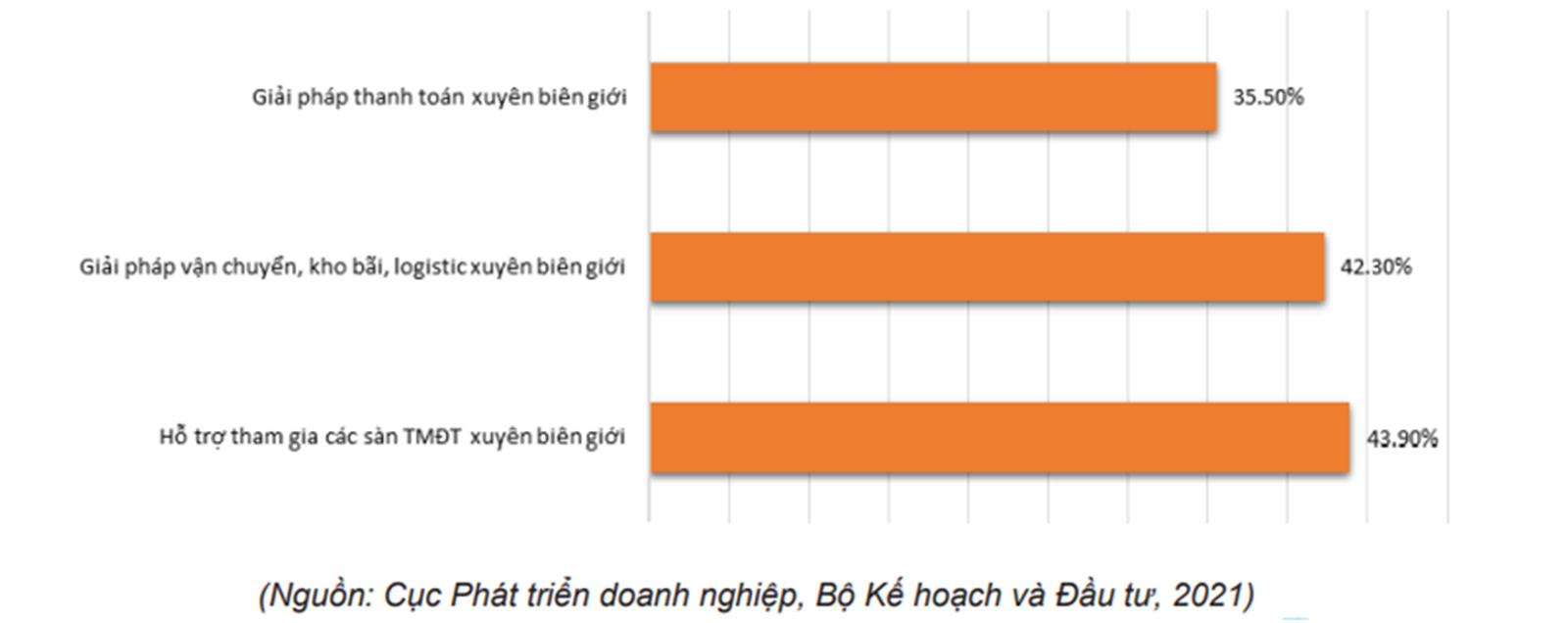 Đối với các doanh nghiệp muốn chuyển đổi số để thúc đẩy xuất khẩu, có tới 43,9% doanh nghiệp có nhu cầu hỗ trợ từ các sàn thương mại điện tử xuyên biên giới như hướng dẫn việc khởi tạo và duy trì tài khoản, xây dựng mô hình kinh doanh, tiếp thị, vận chuyển khi tham gia các sàn thương mại điện tử; 42,3% có nhu cầu hỗ trợ về các giải pháp vận chuyển, kho bãi, logistics xuyên biên giới và 35,5% doanh nghiệp tìm kiếm các giải pháp thanh toán xuyên biên giới.