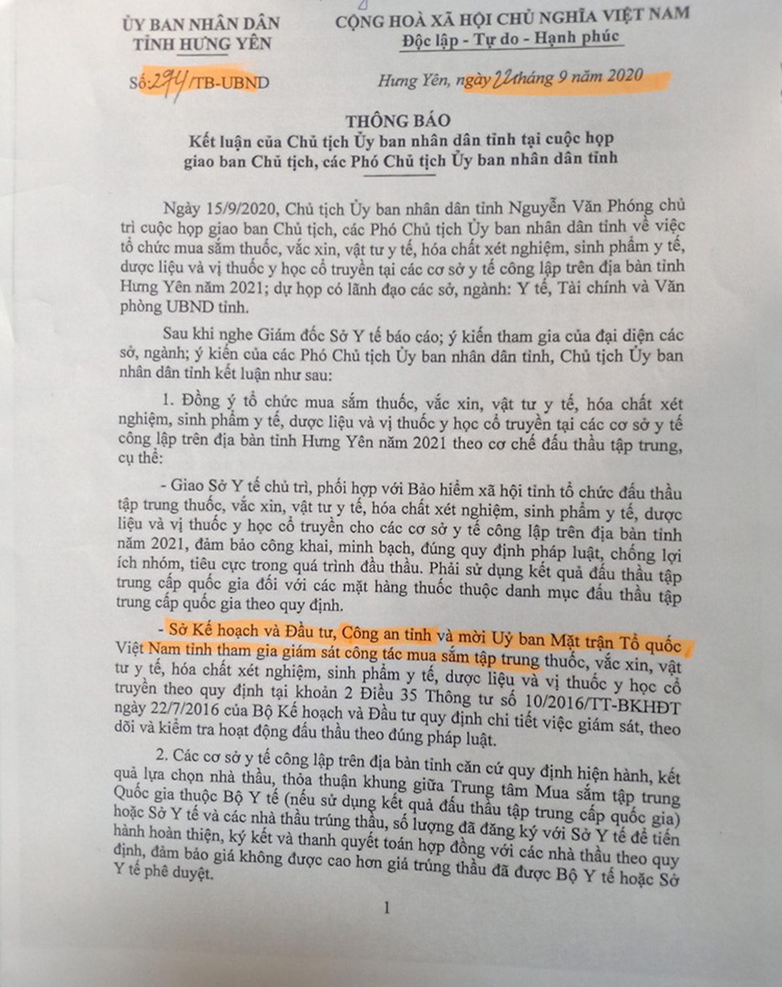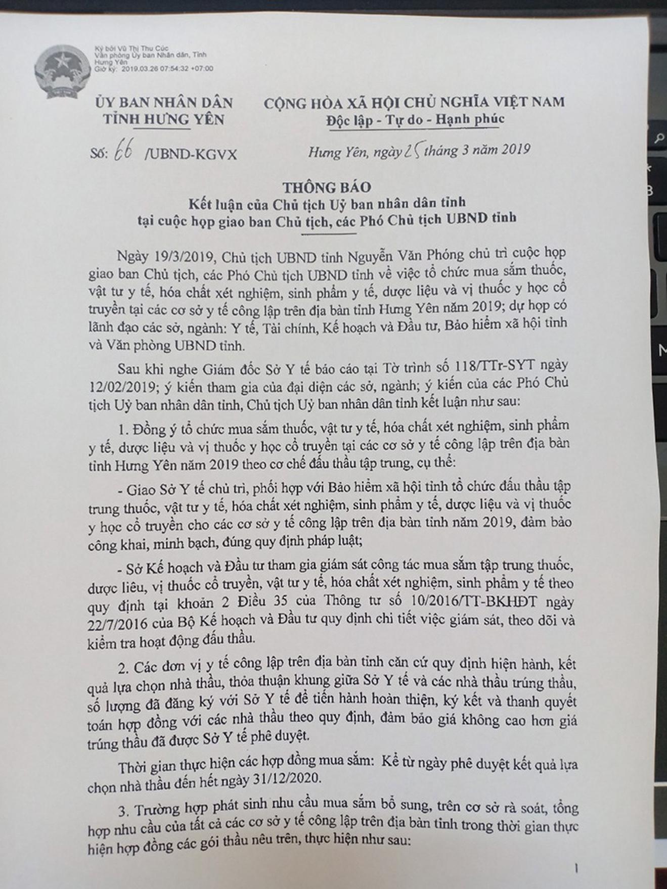 Ông Hùng dẫn chứng: Tại Thông báo số 66/UBND-KGVX ngày 25/3/2019 và Thông báo số 274/TB-UBND ngày 22/9/2020 thông báo kết luận của Chủ tịch UBND tỉnh Hưng Yên chỉ rõ, đối với các gói thầu có tổng trị giá từ 01 tỷ đồng trở lên, Sở Y tế thẩm định danh mục, dự toán và kế hoạch lựa chọn nhà thầu trình UBND tỉnh xem xét, phê duyệt. Đối với các gói thầu có tổng trị giá từ 100 triệu đồng đến dưới 01 tỷ đồng, Sở Y tế tổ chức phê duyệt danh mục, dự toán, thẩm định và phê duyệt kế hoạch lựa chọn nhà thầu theo duy định. Đối với các gói thầu có giá trị dưới 100 triệu đồng, các đơn vị tự tổ chức mua sắm theo định.
