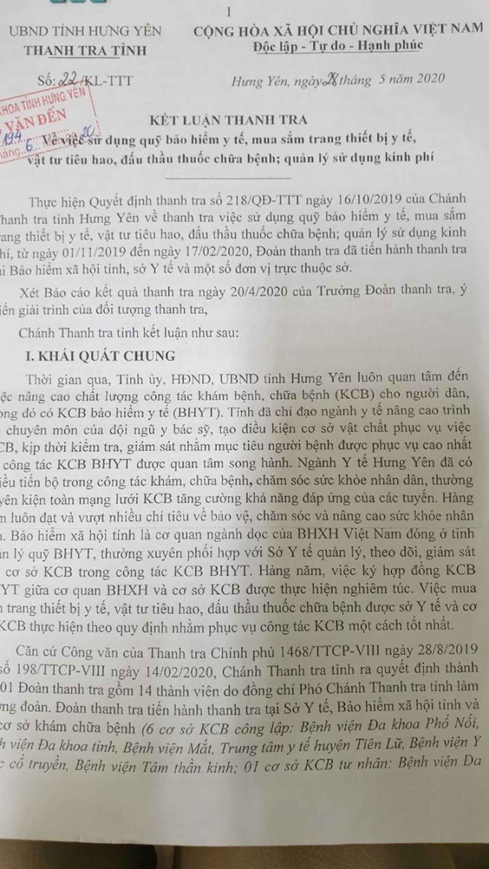 Lãnh đạo Bệnh viện Đa khoa cũng cho biết, tại Kết luận thanh tra số 22/KL-TTT ngày 28/5/2020, Thanh tra tỉnh Hưng Yên đã kết luận việc sử dụng quỹ bảo hiểm y tế, mua sắm trang thiết bị y tế, vật tư tiêu hao, đấu thầu thuốc chữa bệnh; quản lý sử dụng kinh phí cũng như trình tự, thủ tục đấu thầu; thẩm định phê duyệt giá kế hoạch; kế hoạch đấu thầu; hồ sơ mời thầu, đánh giá hồ sơ dự thầu tại Bệnh viện Đa khoa tỉnh Hưng Yên là đúng quy định.
