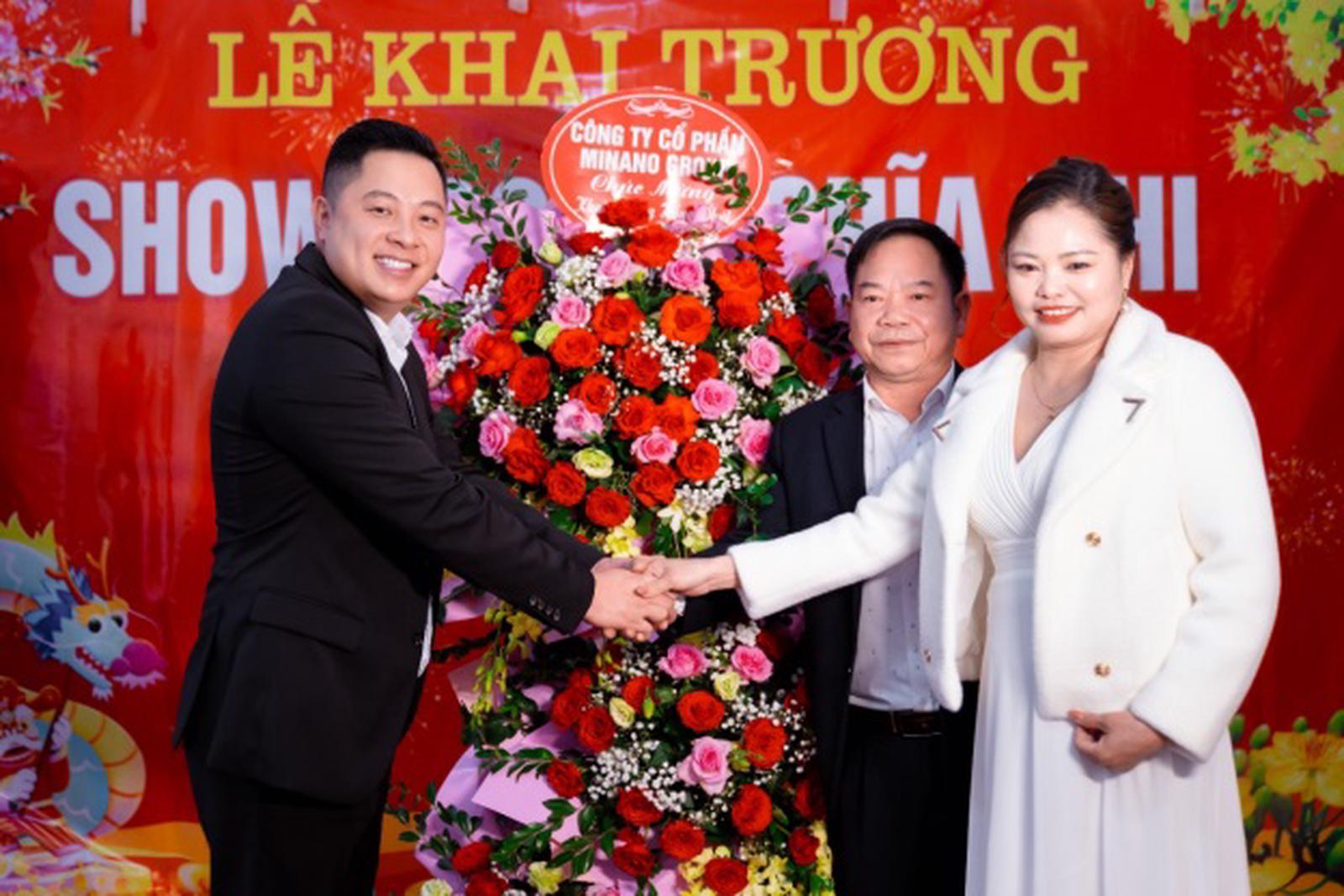 Tổng giám đốc Công ty Cổ phần Minano Group Hoàng Đức Chung (bên trái) tham dự Lễ khai trương siêu thị Vật Liệu Xây Dựng Thật Nghĩa Nhi tại Bắc Giang.