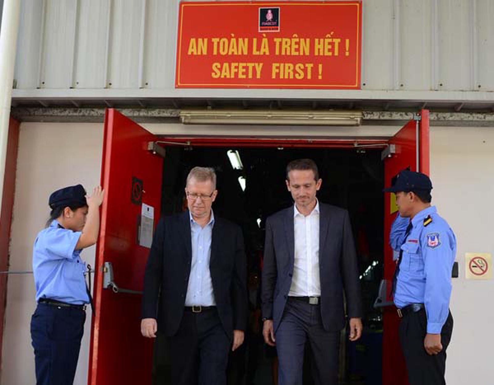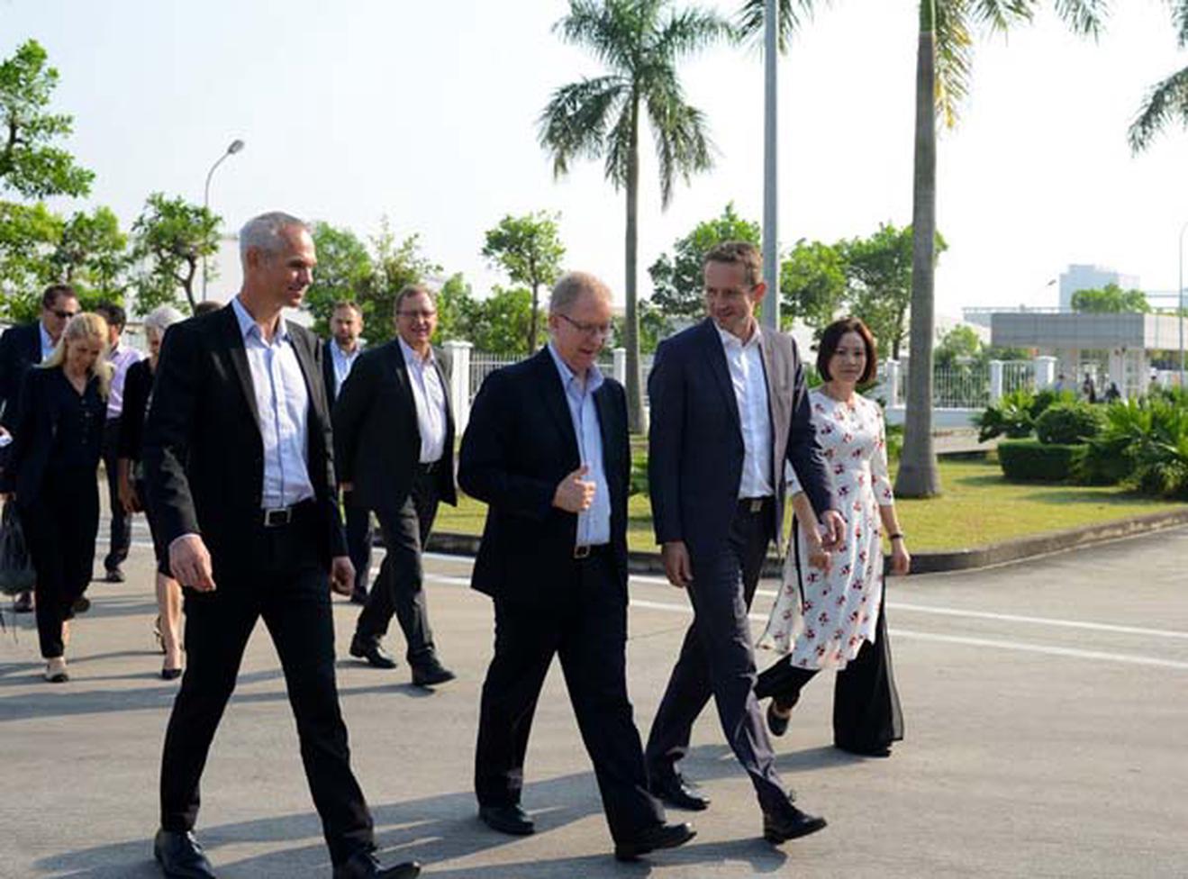 Bộ trưởng Ngoại giao Đan Mạch Kristian Jensen (hàng đầu, thứ 3 từ trái sang) cùng Giám đốc Mascot Việt Nam Thomas Bo Pedersen (hàng đầu, thứ hai từ trái sang) thăm nhà máy Mascot ở khu công nghiệp Tân Trường, Cẩm Giàng, Hải Dương.