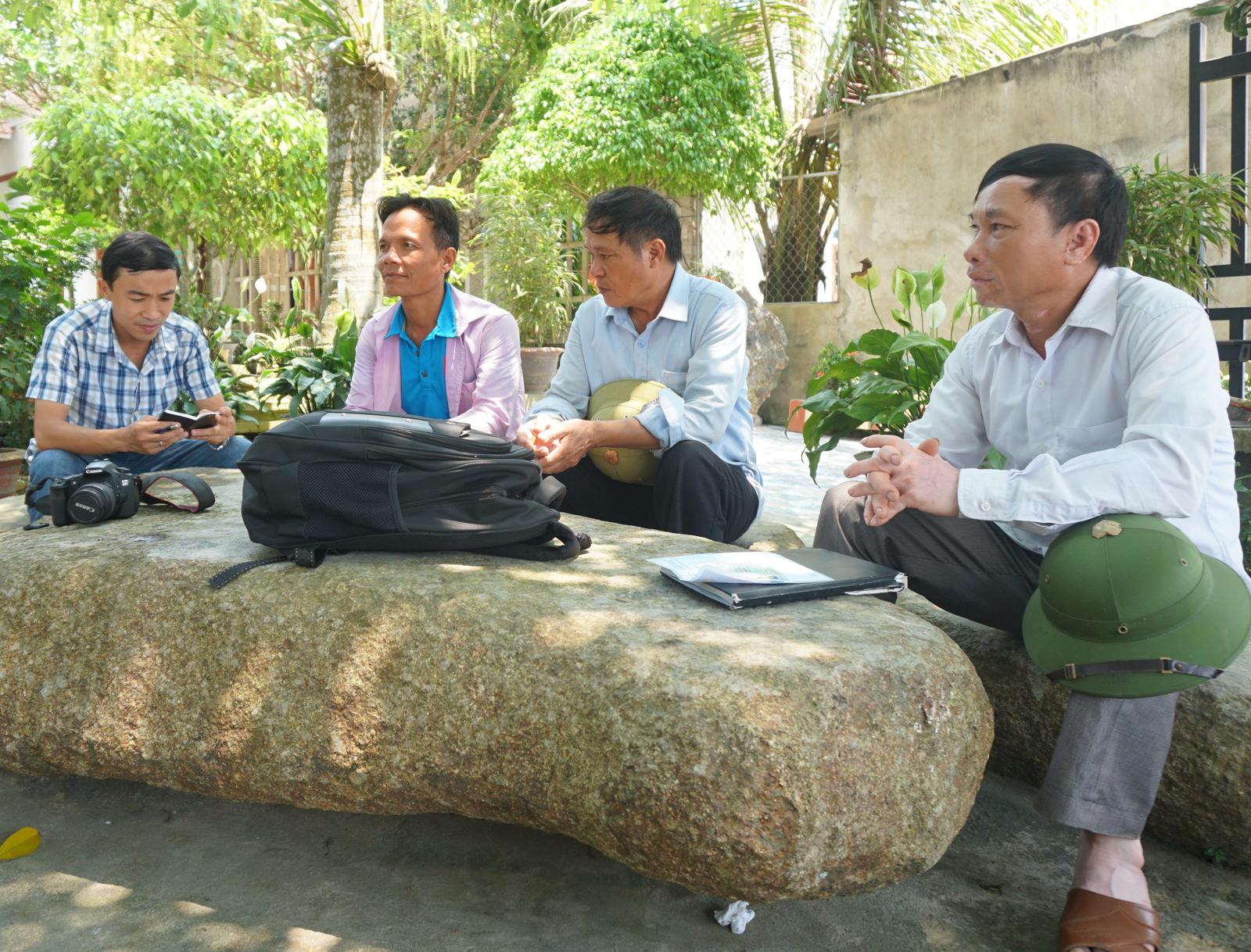 Phóng viên (ngoài cùng, bên trái) làm việc với người dân sống hai bên sông Nghèn. Ảnh: Nguyên Dũng