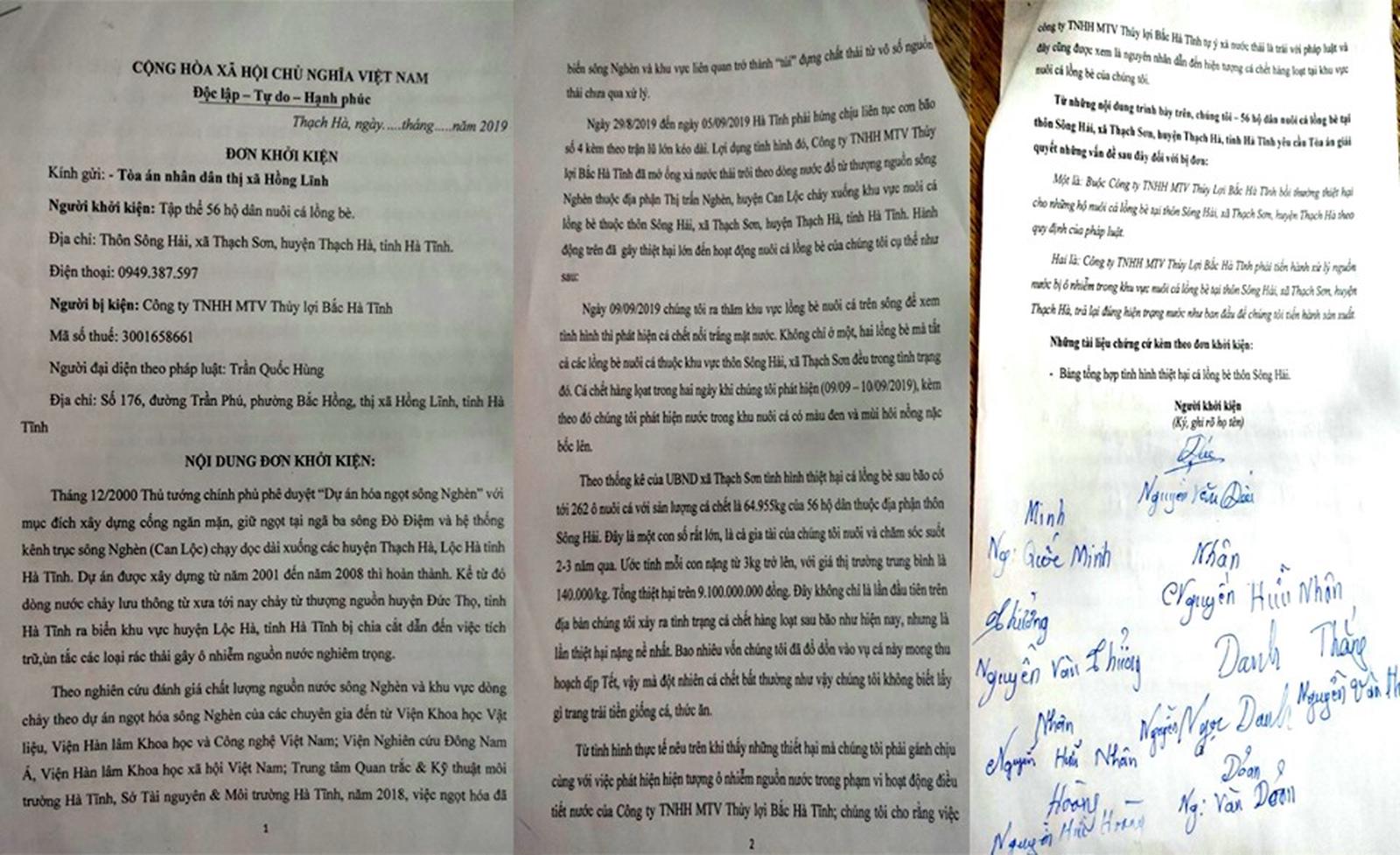Cho rằng việc xả lũ qua cống Đò Điểm là nguyên nhân chính gây cá chết nên vừa qua 56 hộ dân thôn Sông Hải (xã Thạch Sơn, huyện Thạch Hà) đã đồng loạt làm đơn khởi kiện Công ty TNHH MTV Thủy lợi Bắc Hà Tĩnh ra Tòa án nhân dân thị xã Hồng Lĩnh (Hà Tĩnh) để đòi bồi thường thiệt hại.
